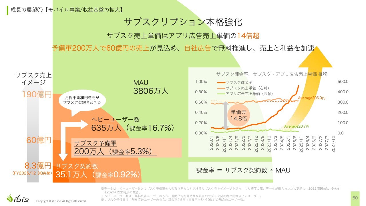 契約率が非常に良い勢いで増加しており、現在の35.1万人を200万人にまで増やし、課金率を5.3パーセントにすることを目標としています。これにより、サブスクリプションでの売上が60億円になると見込んでいます。