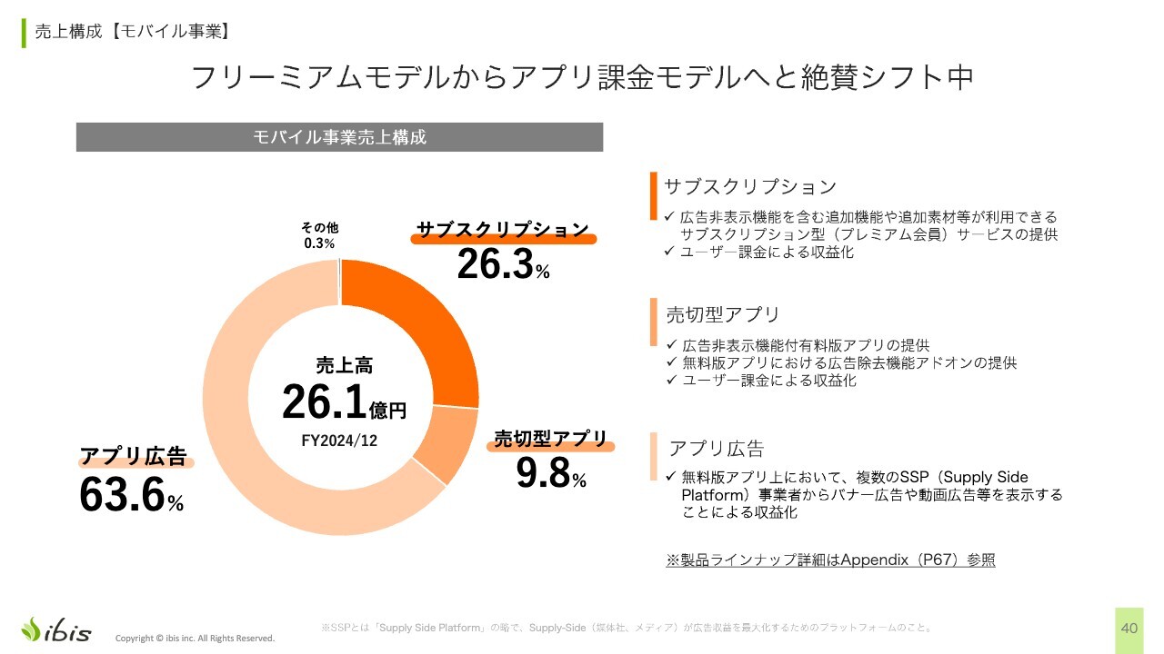 ビジネスモデルについては、サブスクリプション、売切型、アプリ広告売上の3つがあります。先ほどお話ししたとおり、当第3四半期においては、サブスクリプションと売切型の合計が50パーセントを超えました。