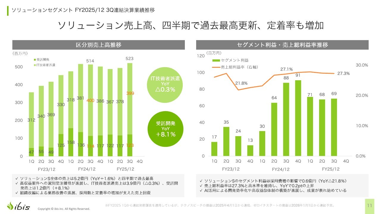 続きまして、ソリューションセグメントの内訳についてです。IT技術者派遣はYoY0.3パーセント減となり、受託開発はYoY8.1パーセント増となりました。全体としては、第4四半期で一時的に下がっていたものの、回復してきています。
