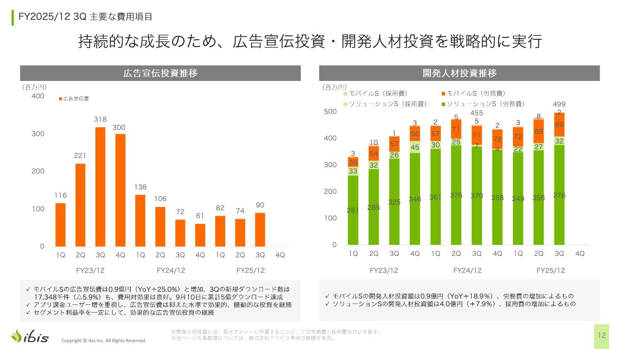 スライドの右側のグラフで、開発人材投資の推移を示しています。開発時の人件費や採用費が含まれていますが、モバイルセグメントでは安定して右肩上がりの成長を維持しており、ソリューションセグメントも回復傾向が続いています。