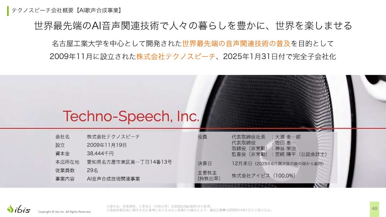 AI歌声合成事業では、テクノスピーチを完全子会社化しました。代表のうちの1人は名古屋工業大学の教授で、合成音声の分野において世界的に権威のある方です。