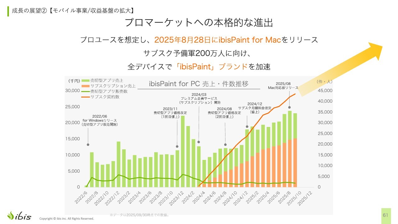 2025年の成長可能性に関する事項については、今年2月に作成した計画から大きな変更はありません。成長の主軸はサブスクリプションであり、2年後には課金売上が広告売上を上回る見通しですが、サブスクが順調なため実際にはもっと早まる見込みです。サブスクリプション予備軍200万人(想定売上60億円)に対する課金推進を強化するほか、高機能戦略を継続し、プロ市場向けとしてMac版を8月28日にリリースしました。
