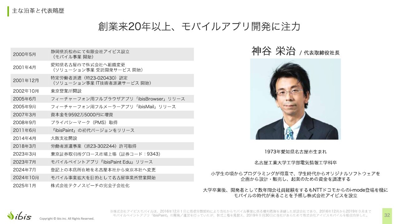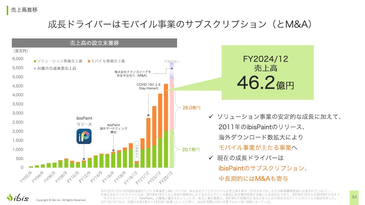 こちらは創業時からの売上推移です。直近4年間で「ibisPaint」が急速に売れたことで上場に至りました。「ibisPaint」は2011年、今から14年前にリリースしています。