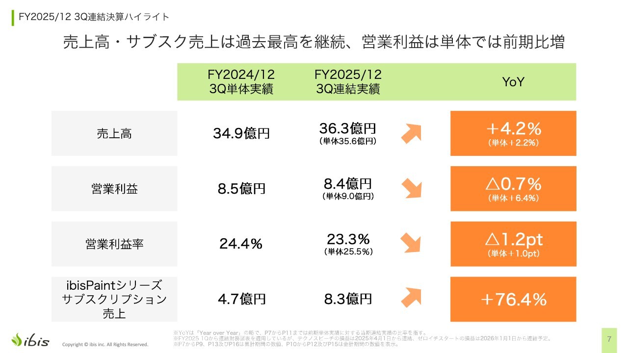 2025年12月期第3四半期連結決算についてです。売上高およびサブスクリプション売上が過去最高を更新し、営業利益は単体で前年同期比増となりました。