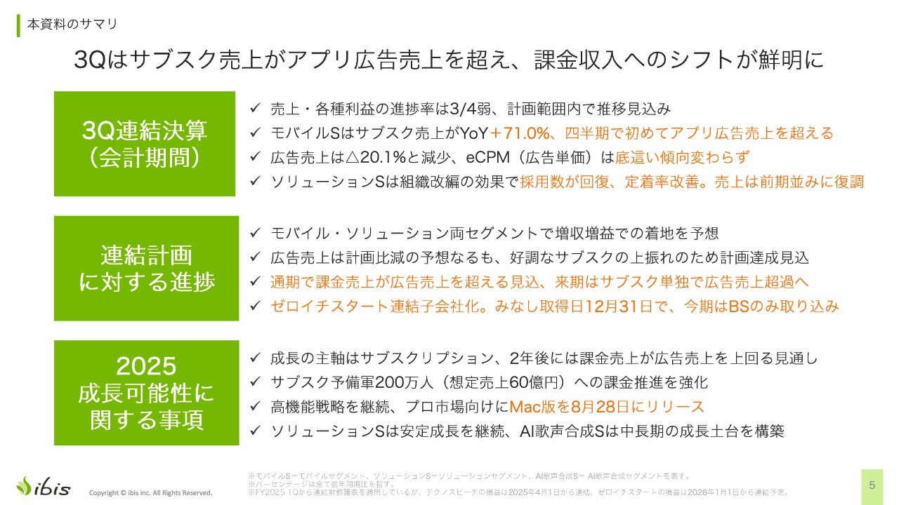 本資料のサマリです。第3四半期において、サブスクリプション売上がアプリ広告売上を上回り、課金収入へのシフトが鮮明となりました。