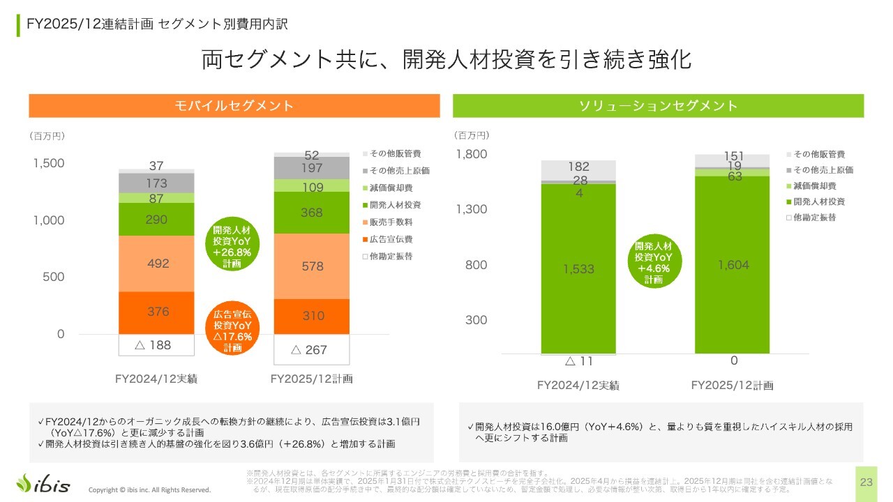 コストの計画についてです。モバイルセグメントは開発人員の増加によりコストが増加する一方で、広告費がやや減少しています。ソリューションセグメントでは開発人員のコストがやや増加しています。