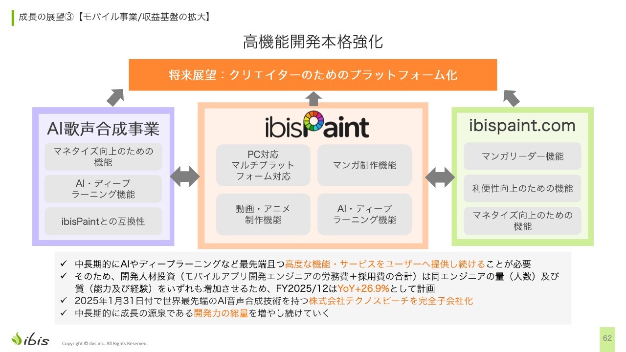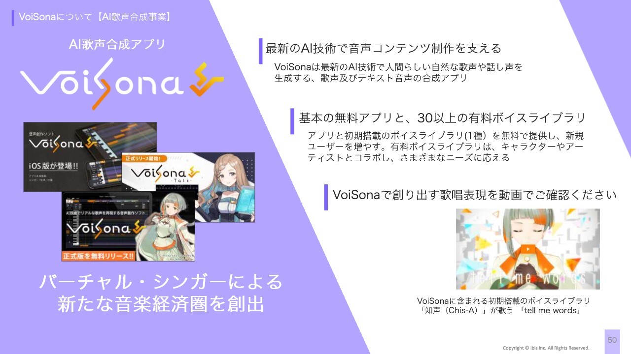 「VoiSona」のアプリ、「ibisPaint」のアプリ、そして投稿サイトがシナジーを生むよう、アプリの改良が必要ですが、相互に利用できるようにする計画です。例えばミュージックビデオであれば、AI歌声合成事業で音楽が作成可能ですし、それを「ibisPaint」のアニメーション機能と組み合わせてみたり、このあたりを強化していきたいと考えています。