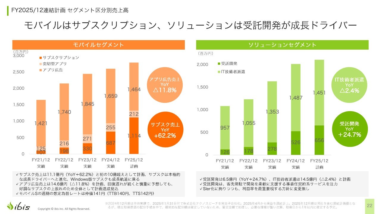 続きまして、モバイルセグメント内の内訳についてです。スライド左側は売上の内訳を示しています。アプリ広告売上はYoY20.1パーセント減、サブスクリプション売上はYoY71.0パーセント増となり、アプリ広告売上が計画に比べて下振れしています。