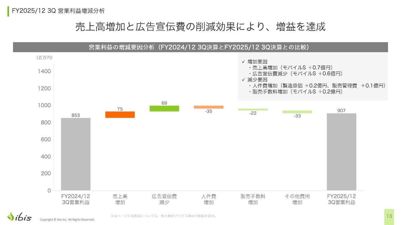 利益の増加要因についてです。単体で示しているので増加となっています。売上高増加や広告宣伝費の減少が上昇要因となっています。一方で、人件費や販売手数料、その他費用の増加が減少要因となっています。