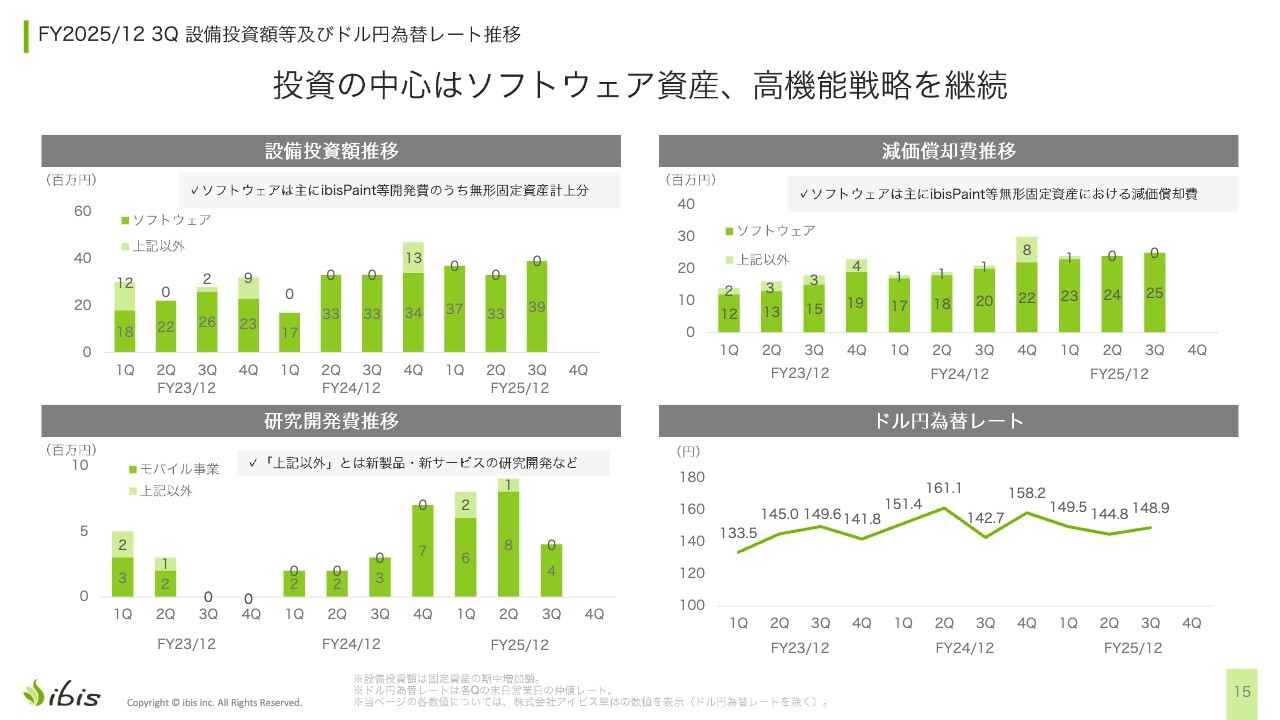 FY2025/12 3Q 設備投資額等及びドル円為替レート推移