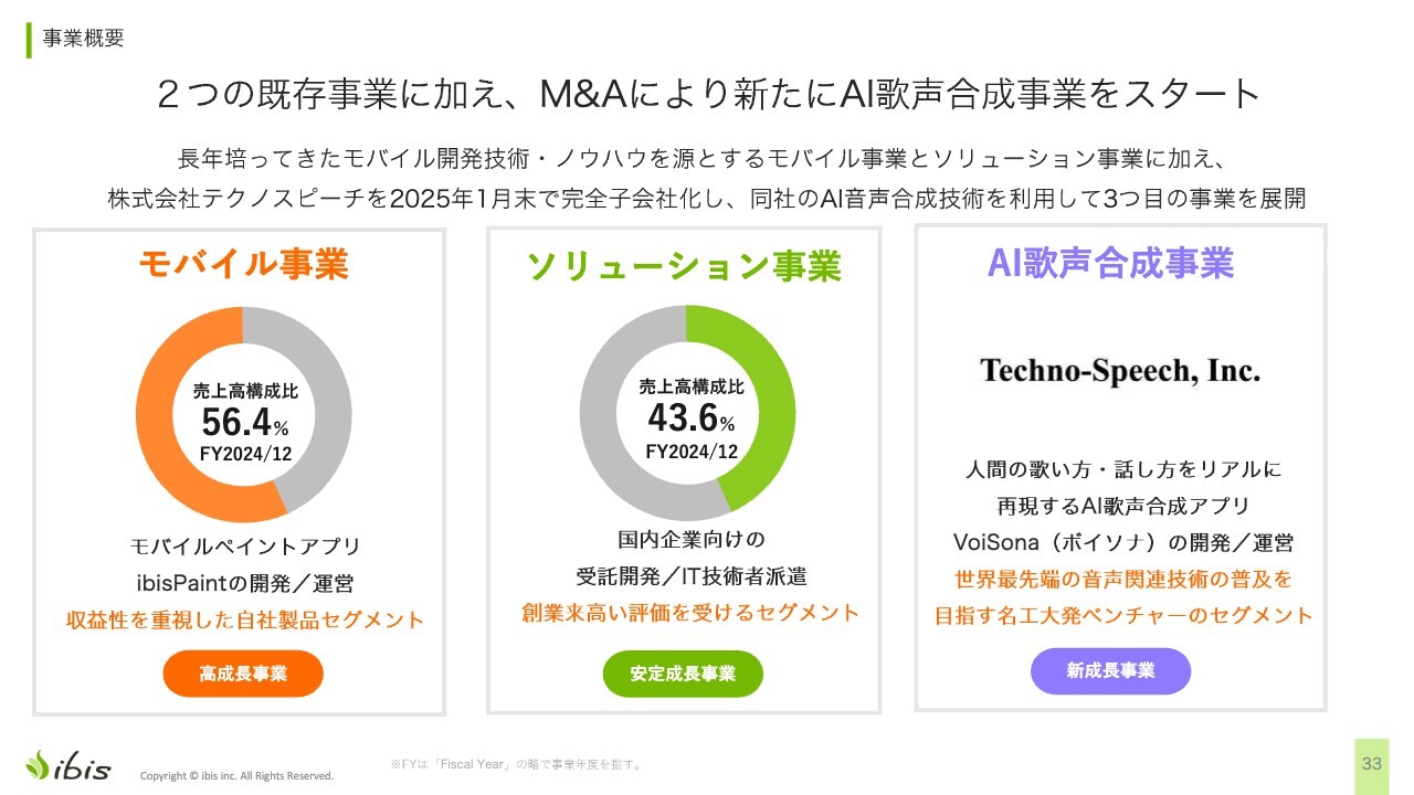 事業は、モバイル事業、ソリューション事業、AI歌声合成事業の3つがあります。