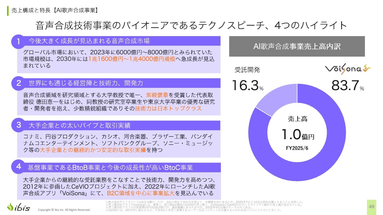 事業の内訳としては「VoiSona」が主力商品であり、一部は受託開発となっています。具体的には、音声合成エンジンを法人に提供し、ゲームやカラオケなどのエンジンとして供給しています。