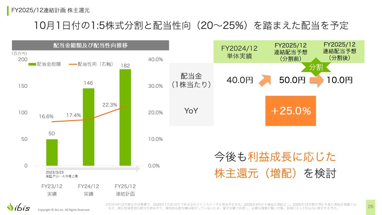 株主還元についてですが、10月1日に発表したとおり、1対5の株式分割を実施しました。予定していた配当金は1株当たり50円を分割し、1株当たり10円としています。YoYでは25パーセント増となっています。