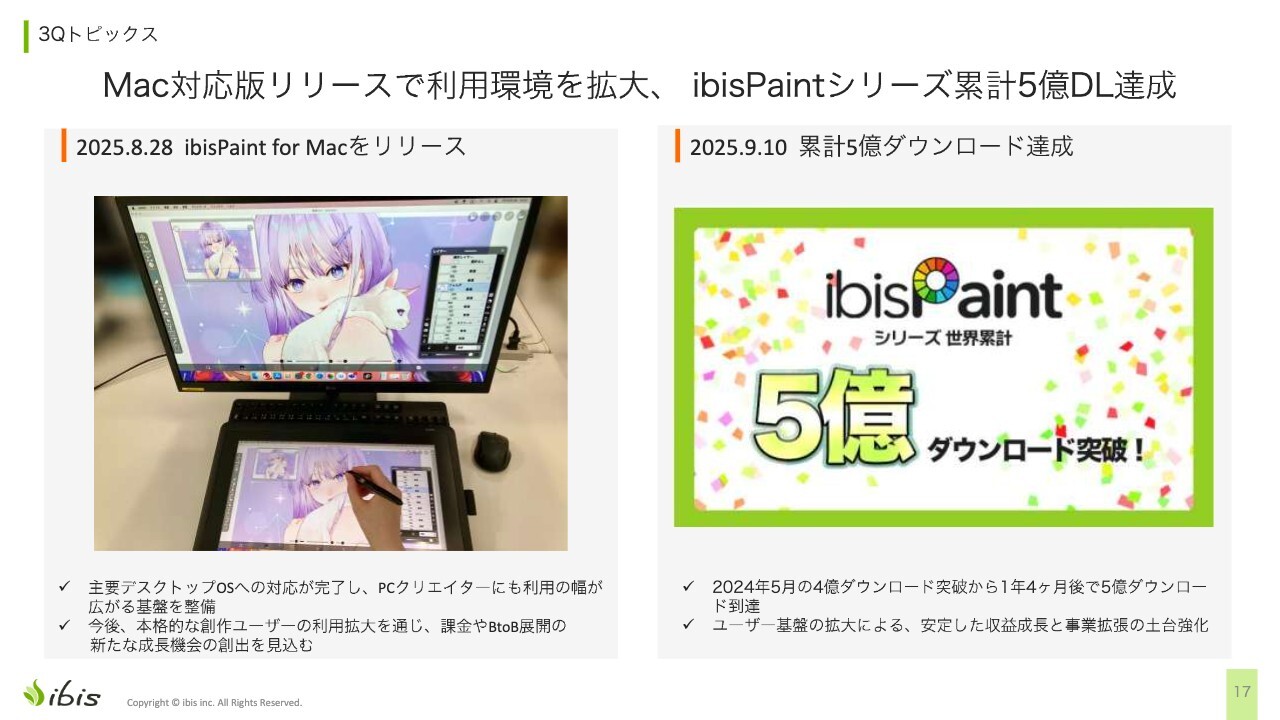 トピックスとして、8月28日に「ibisPaint」のMac版をリリースしました。これまでMacユーザーの方々はiPhoneやiPadで利用していましたが、移行先としてMac版がないことでユーザーが流出してしまう状況がありました。今回のリリースにより、そのような流出を防ぐとともに、プロの方にも今後ご利用いただきたいと考えています。