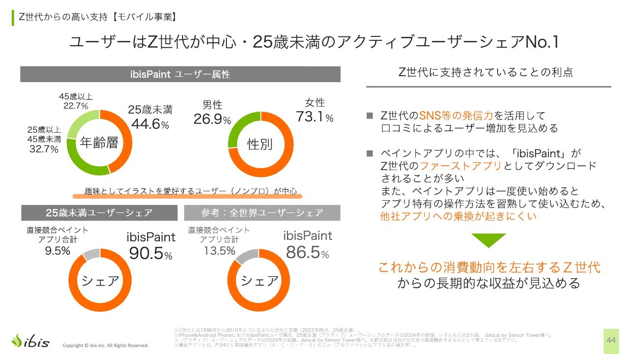 また、今期は広告売上の単価が低迷しており、これが全体の成長鈍化の要因となっています。広告については、年単位で良い年と悪い年があり、この波を避けるのは難しいと考えています。DAUが基盤となりますが、DAU自体は大きな流れで見ると水平飛行といった状況であり、基盤自体は維持できていると思います。そのため、「ibisPaint」事業の基盤は堅調であると見ています。