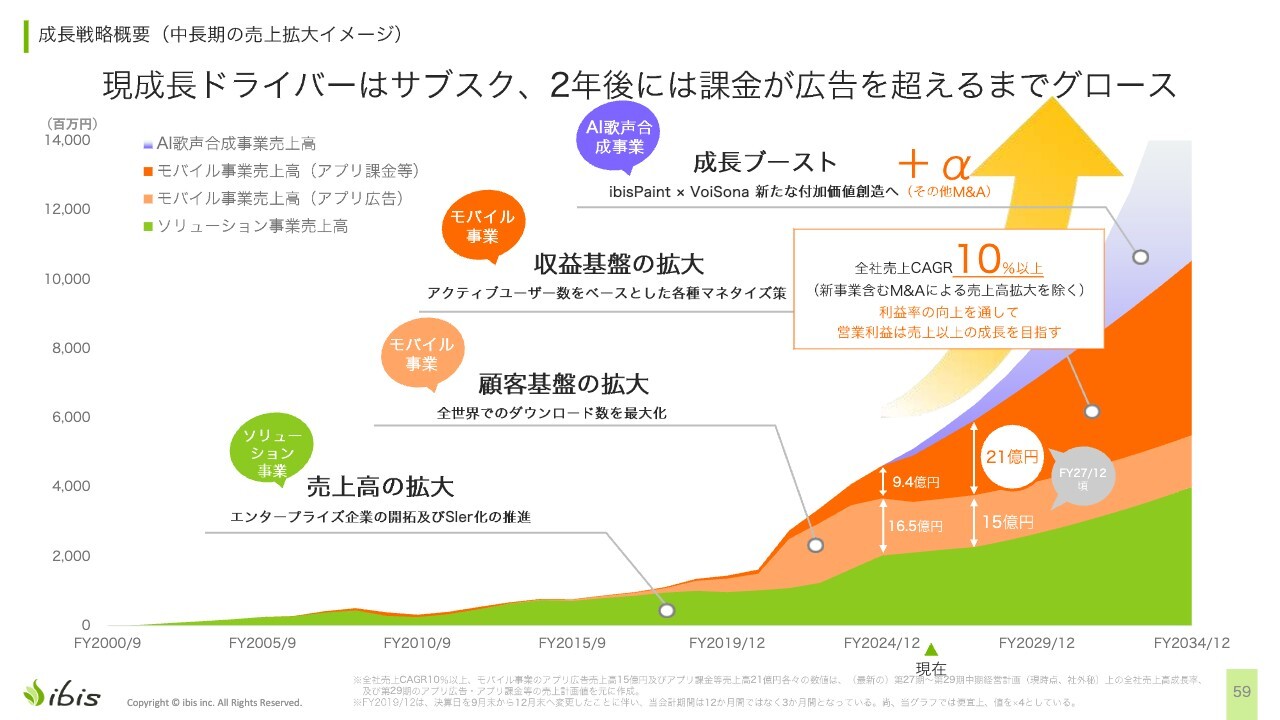 紫色で示されているのはAI歌声合成事業およびM&Aで、新しいチャレンジとして位置付けています。トータルのCAGRは10パーセント以上を目指しています。