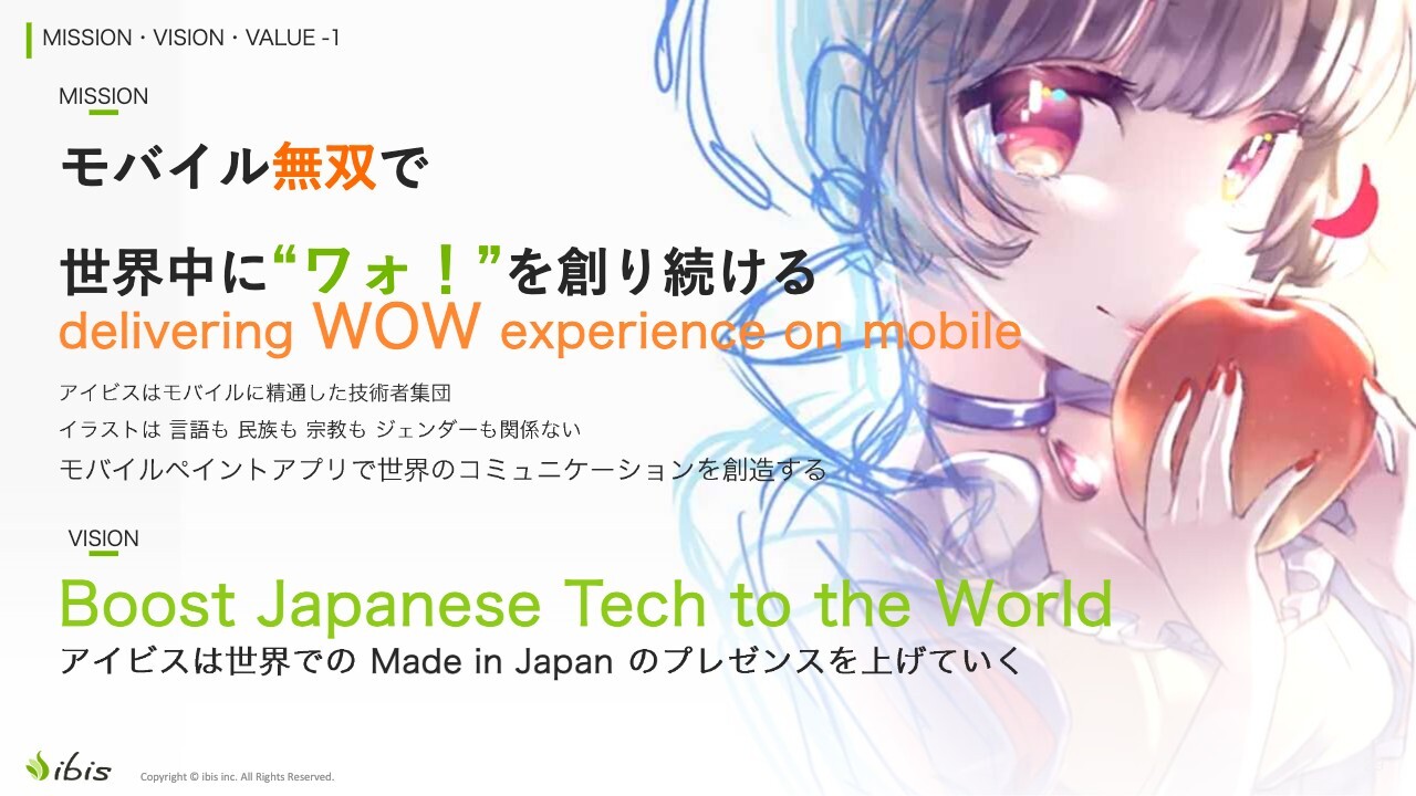 ミッションとして「モバイル無双で世界中に"ワォ!"を創り続ける」を掲げており、モバイルに強いという点と、世界中に驚きを与えたいという思いを表しています。