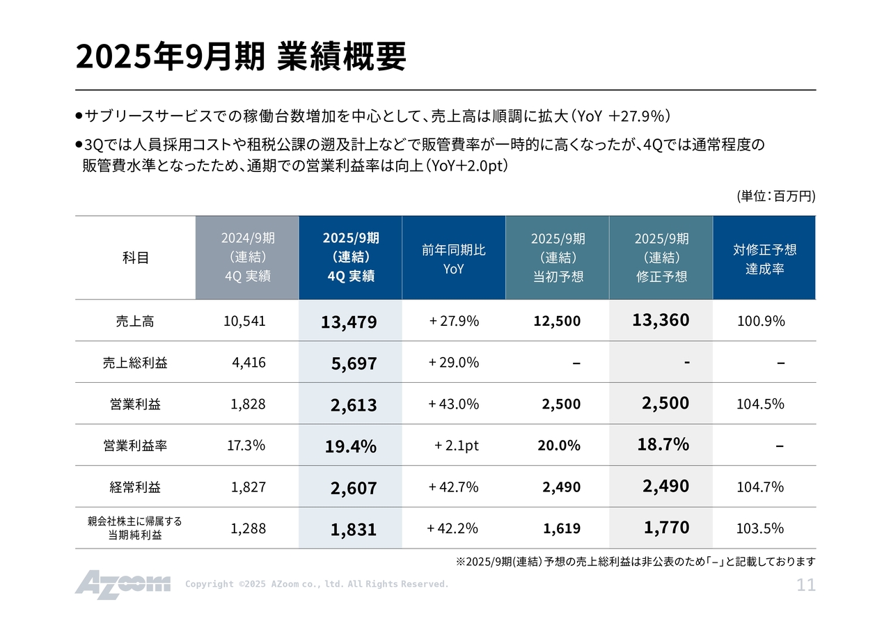 2025年9月期の業績概要です。売上高は134億円、営業利益は26億円、親会社株主に帰属する当期純利益は18億円となりました。非常に良い数字を残せたと考えています。