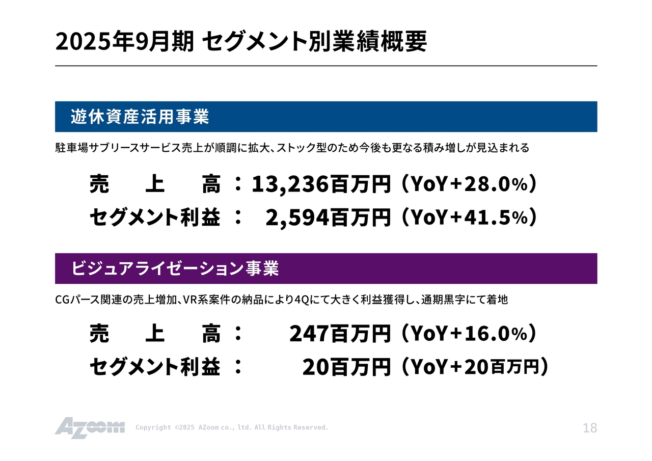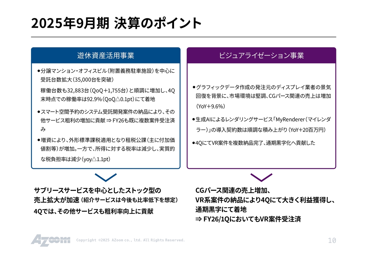 ビジュアライゼーション事業については黒字で着地しており、ストック収益である生成AIを活用したレンダリングサービスが順調に積み上がりました。2026年9月期以降は、受注生産型のパース受託制作だけでなく、このような積み上がり型サービスの拡大によって順調に展開していく見込みです。
