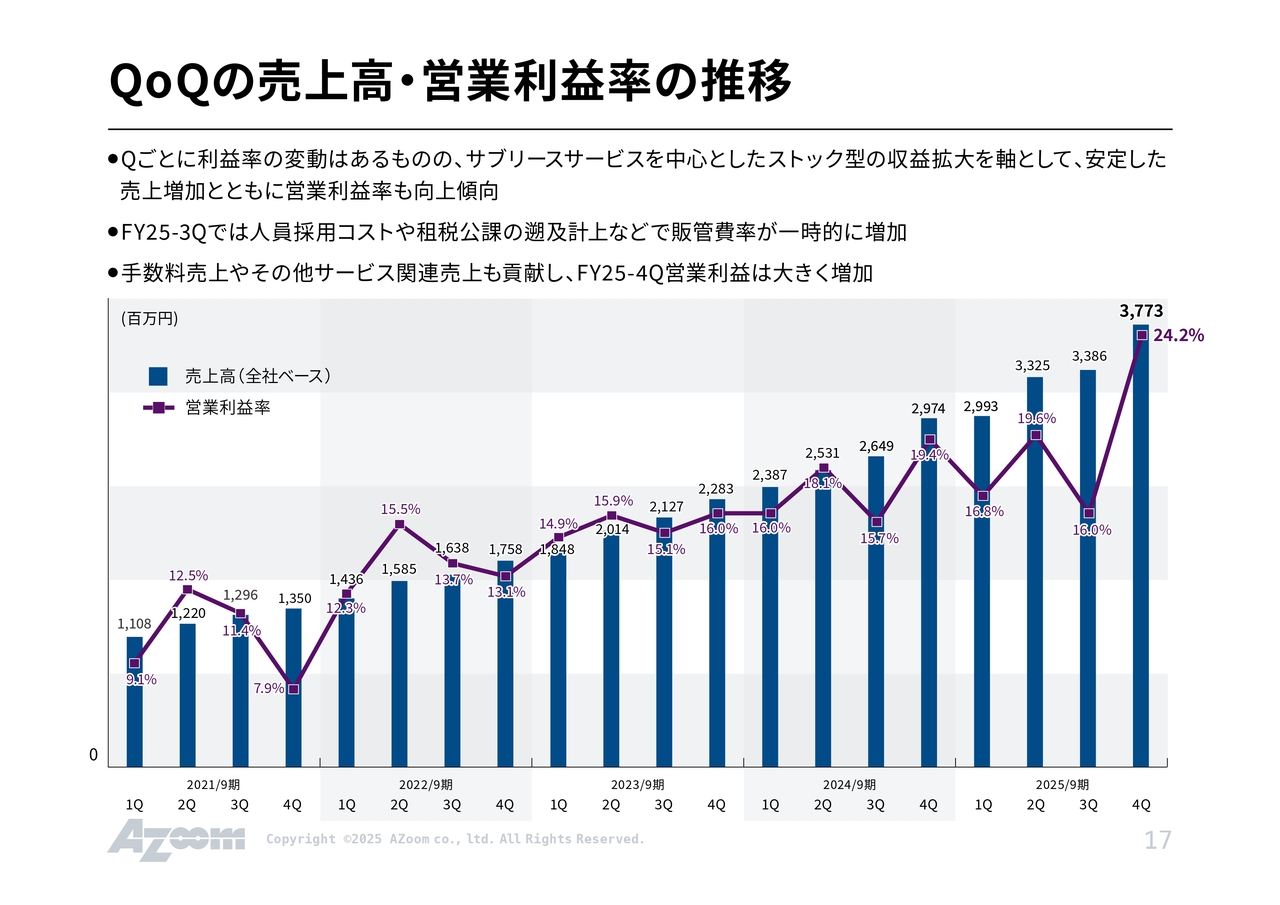 四半期ごとの売上高・営業利益率の推移です。第4四半期は、ショットの手数料売上があったことで営業利益率が一時的に上昇しています。中長期的には、営業利益率25パーセントを目指しています。