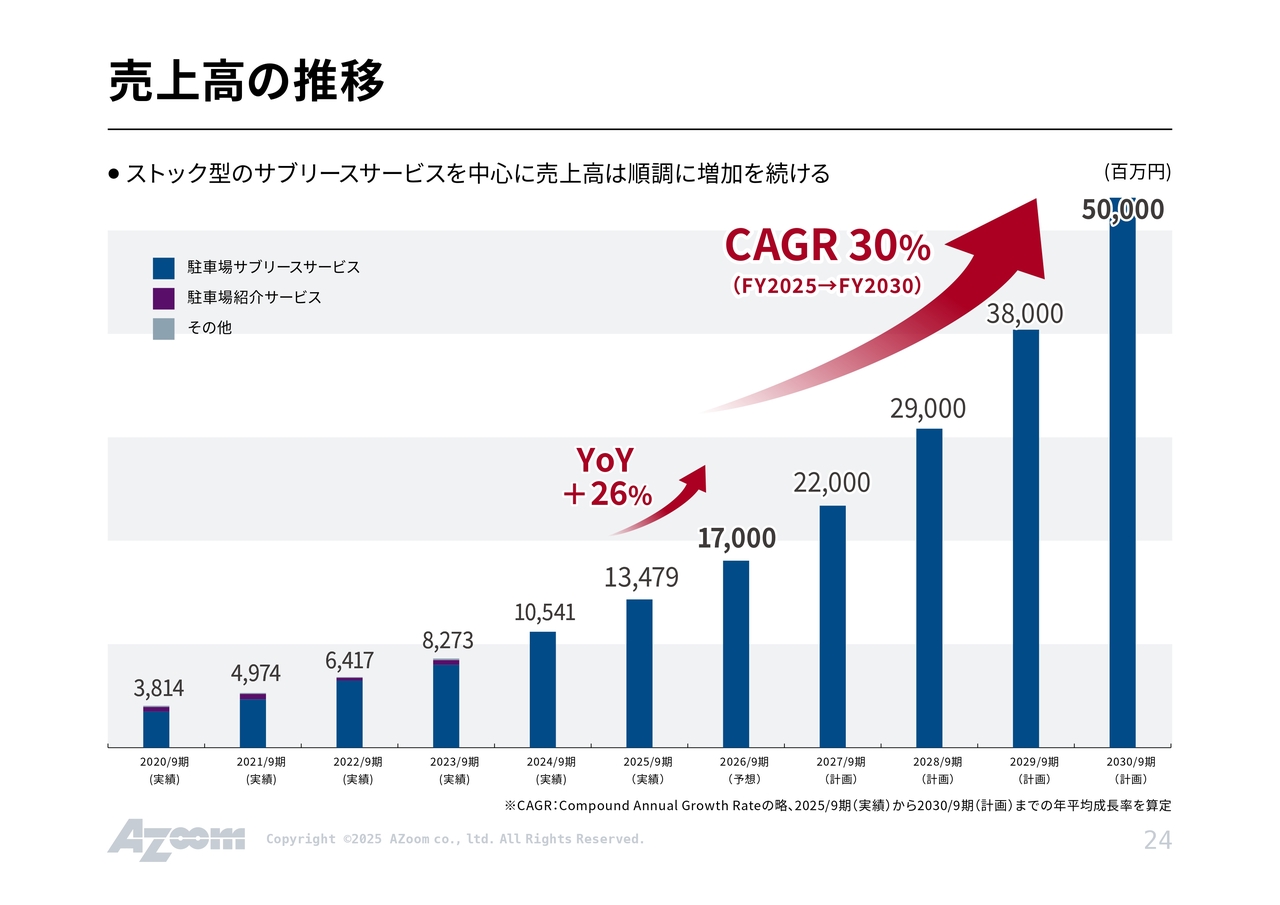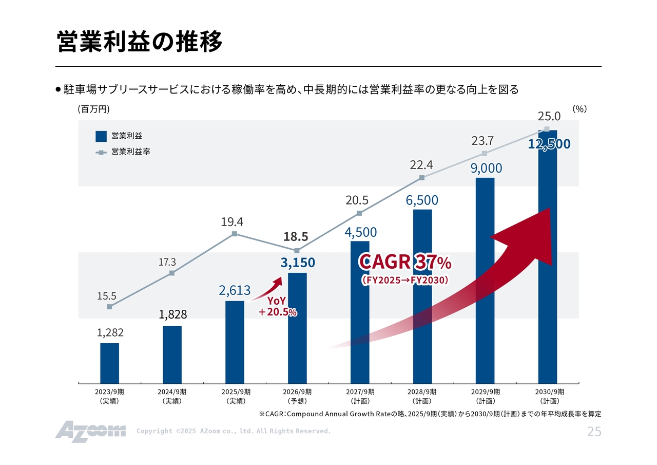 2026年9月期が投資フェーズに入っているため、営業利益の成長曲線はやや鈍化しています。しかし、マーケット自体にはまだ大きな余地があります。この投資フェーズを超えればさらにスケールメリットを享受でき、AIによる効率化も進むため、2030年9月期まで成長が鈍化することはないと考えています。