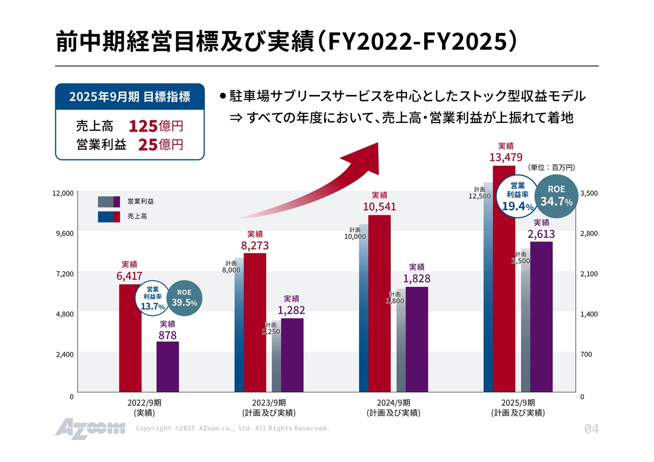また、前回の3ヶ年中期経営計画が終了し、2026年9月期より新たに5ヶ年の中期経営計画を策定しています。2030年9月期の目標としては、売上高500億円、営業利益125億円、ROE40パーセント、受託台数12万台以上を掲げており、非常に意欲的な計画となっています。これらを着実に実現するため、今期からの5ヶ年の挑戦が始まるという状況です。