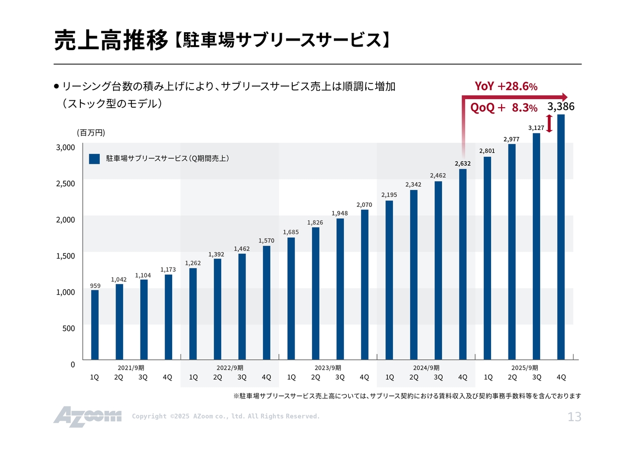 基本的には、賃料収入から駐車場オーナー等への支払賃料を差し引いたものが積み上がりの金額となります。当社はここを常に成長させていく方針です。