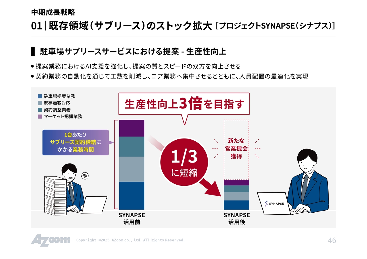 スライドは、当社のユーザーに対するリーシング営業の生産性を3倍に向上させることを目指したものです。契約に至るまでにはさまざまな業務がありますが、「SYNAPSE」を活用することで、それらの業務を一気に圧縮することができます。