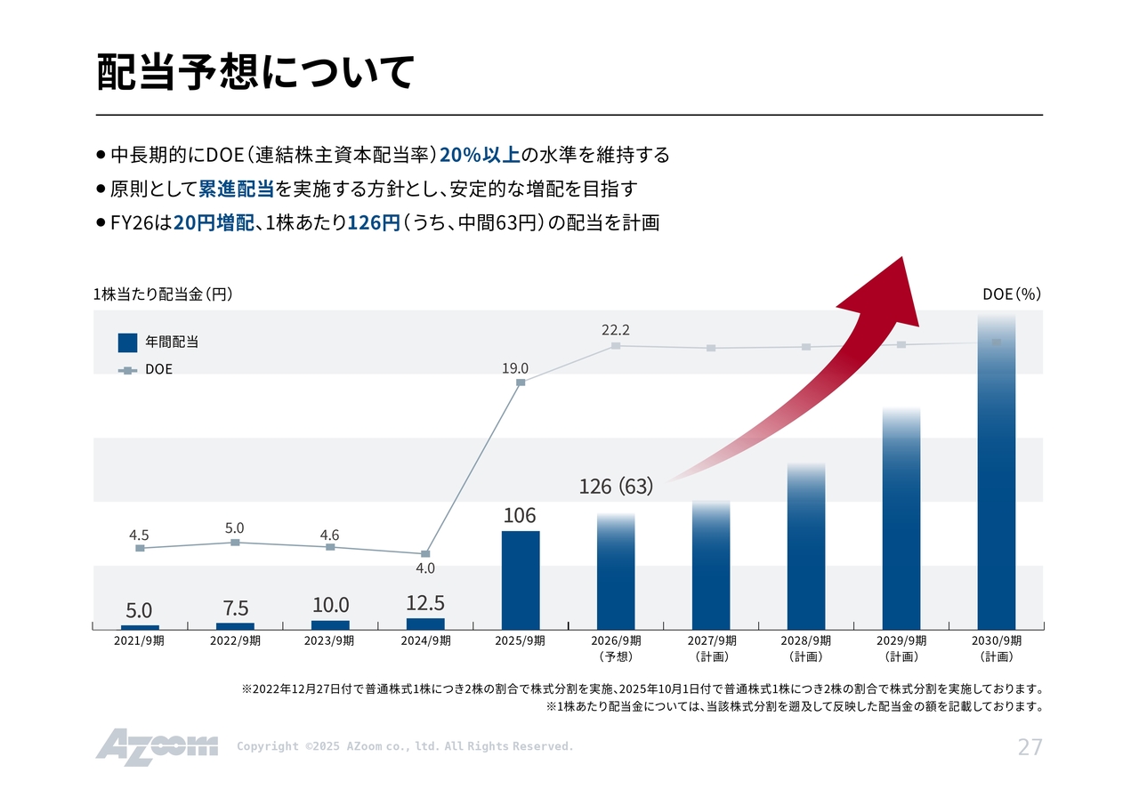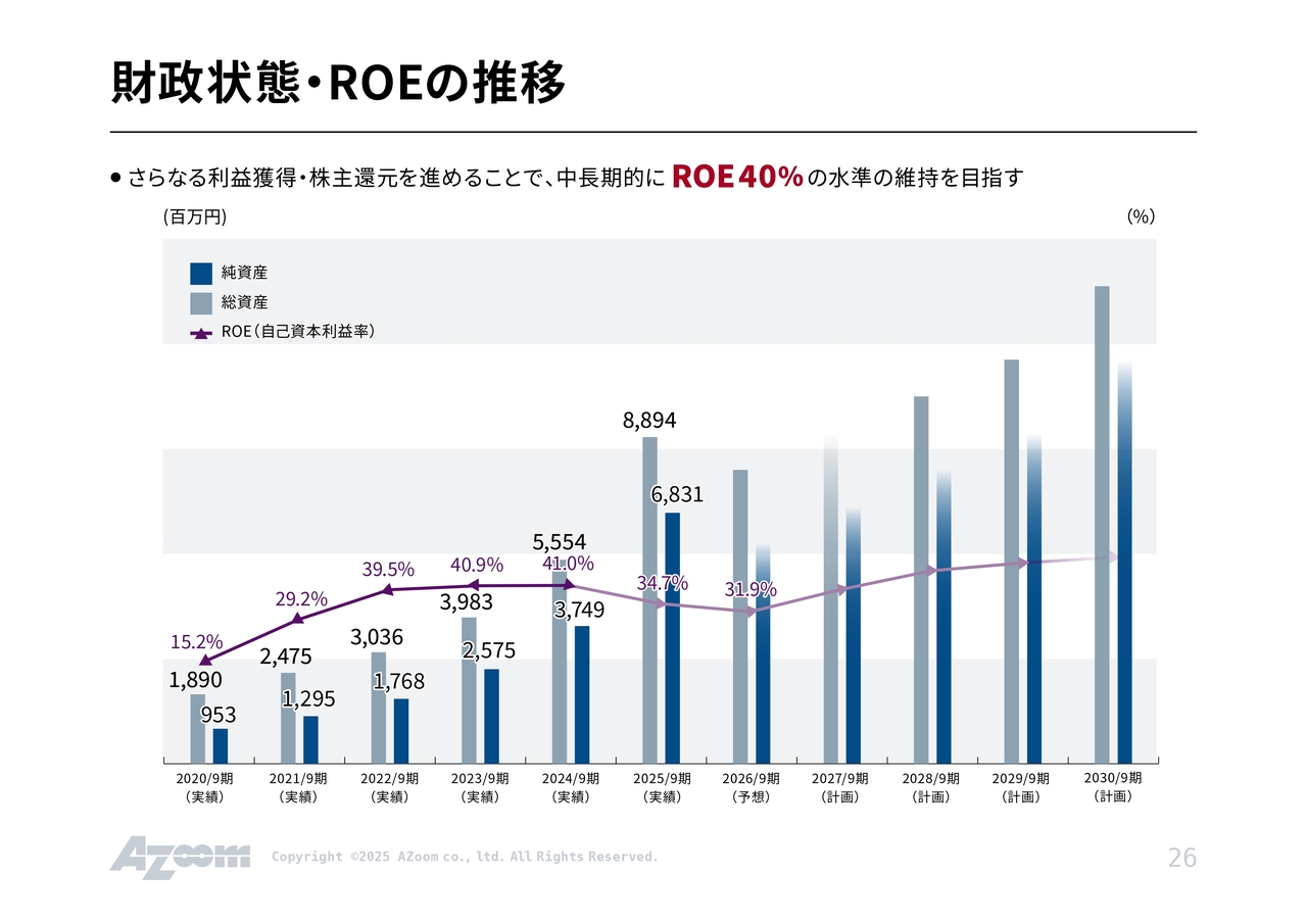 ROEの推移です。2025年9月期はプライム市場への市場変更に伴い増資を行ったため、純資産が積み上がり、ROEの水準が40パーセント台から30パーセント台に落ちています。しかしながら、今後は徐々に40パーセントを超える水準に戻ると想定しています。