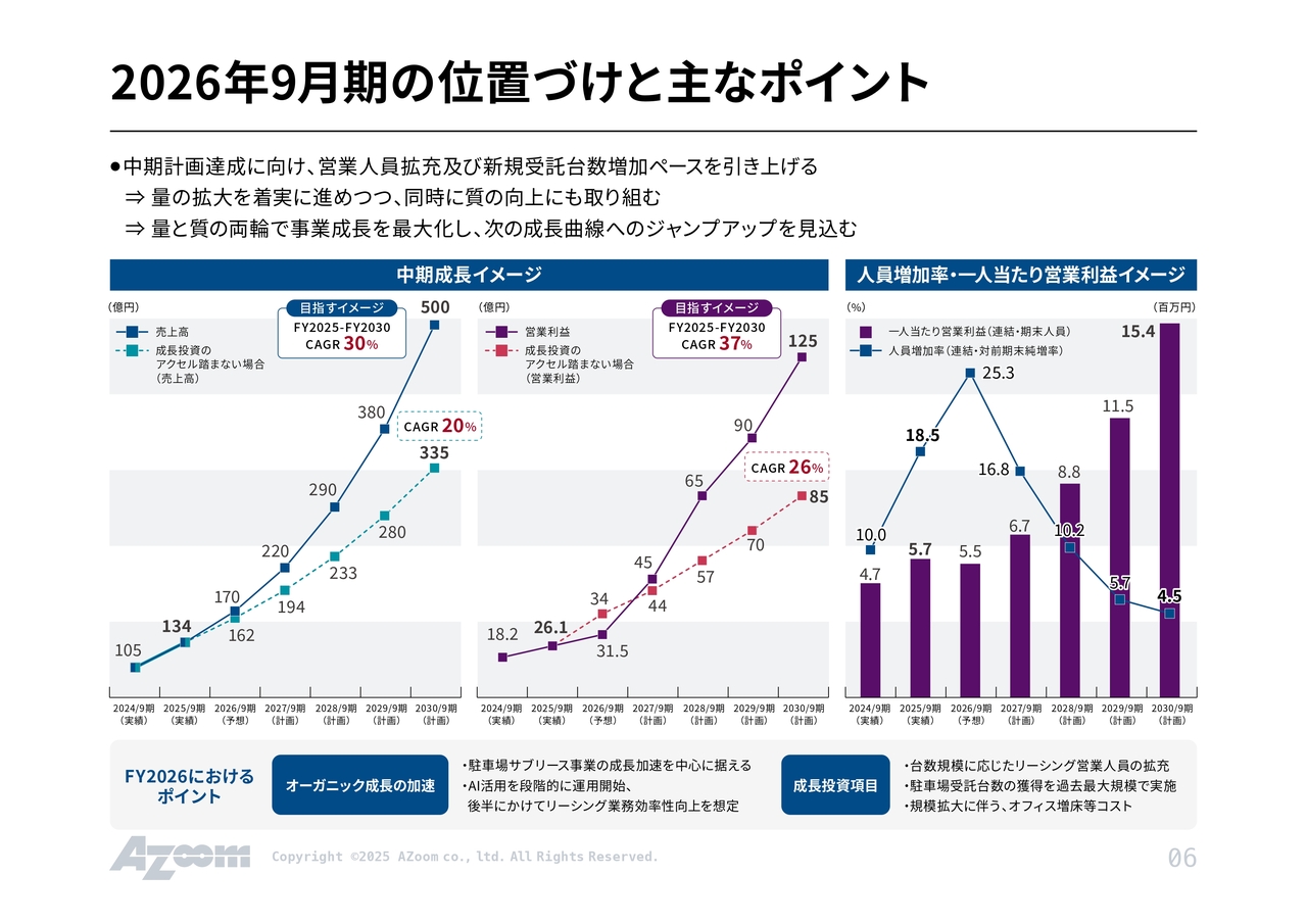 数字としては、売上高は前期比26パーセント増、営業利益は前期比21パーセント増、親会社株主に帰属する当期純利益は前期比20パーセント増を予想しています。ここ3年間の当社の成長力からすると、この数字だけを見るとやや鈍化しているように見えますが、これは5ヶ年計画において、2026年9月期を投資フェーズと位置づけているためです。