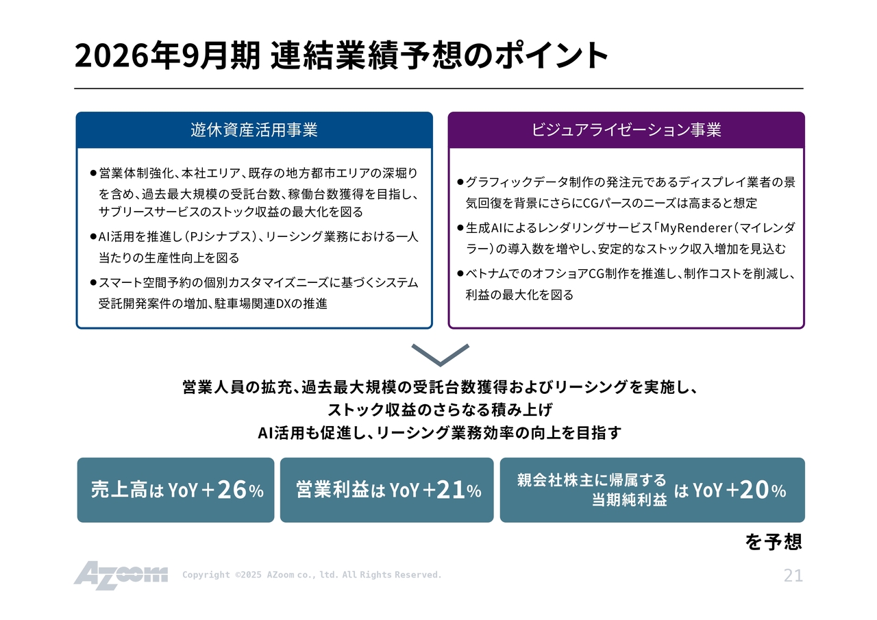 進行期である2026年9月期の連結業績予想のポイントです。遊休資産活用事業では、営業体制の強化、本社エリアや既存の地方都市エリアの深掘りを含め、過去最大規模の受託台数・稼働台数の獲得を目指しています。