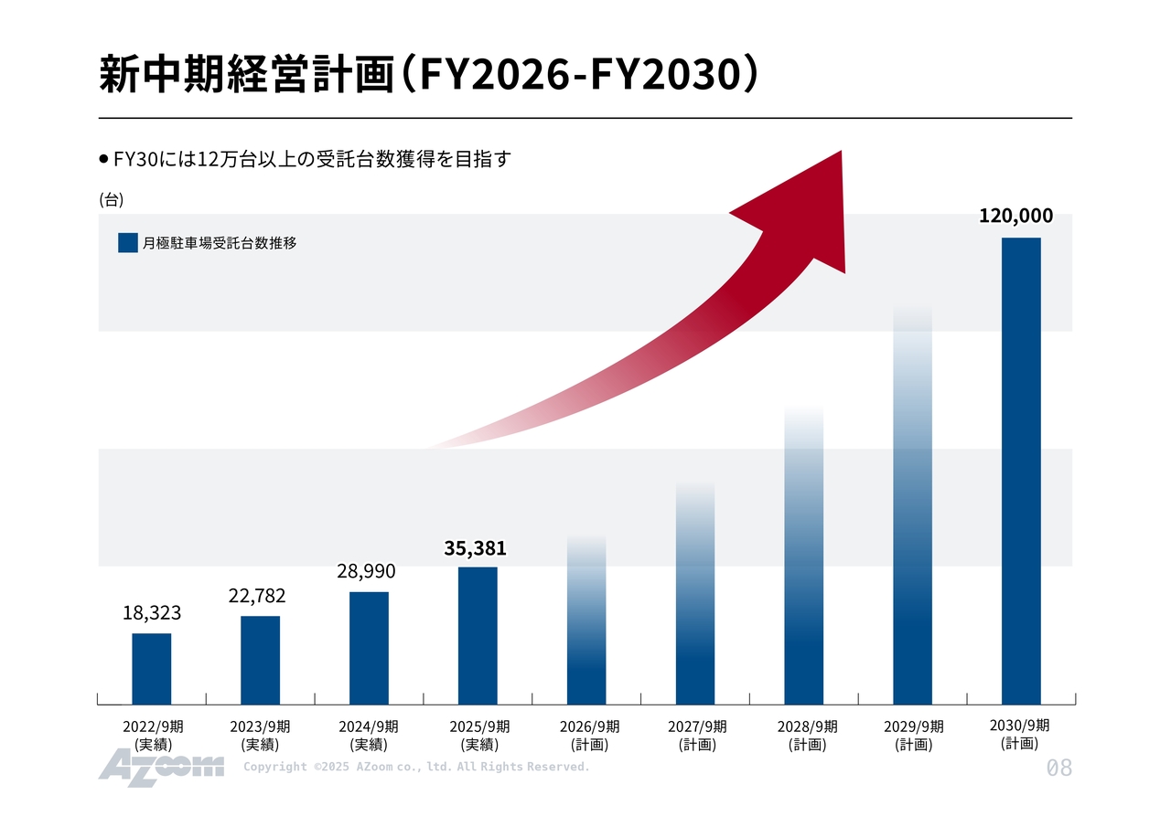 前中期経営計画最終年度である2025年9月期の月極駐車場受託台数については、3万台の計画に対して3万5,000台超で着地しました。