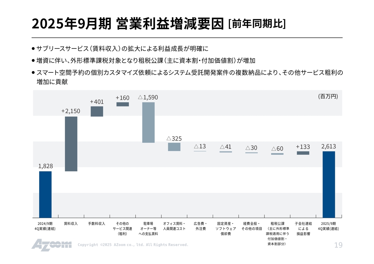 営業利益の増減要因についてご説明します。主な要因としては、賃料収入が21億5,000万円積み上がったことに対し、駐車場オーナー等への支払賃料が15億9,000万円となりました。また、手数料収入が4億円超となったことで、プラスアルファで数字が乗っています。