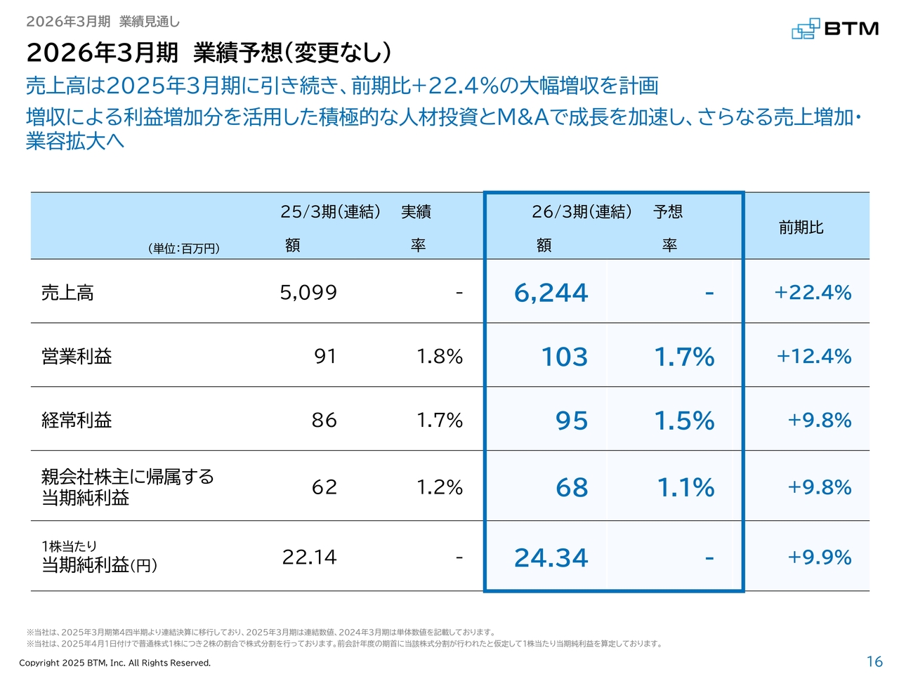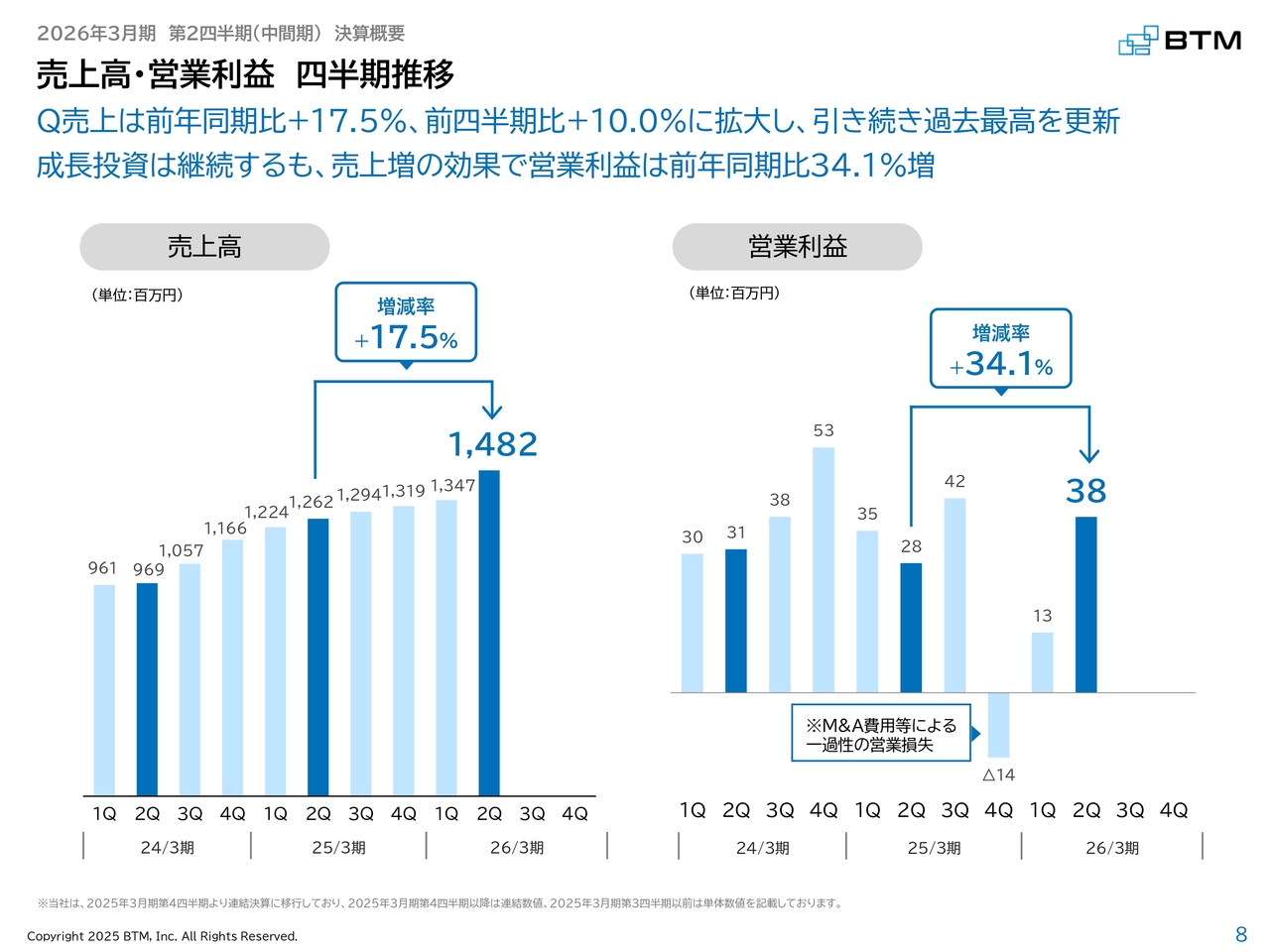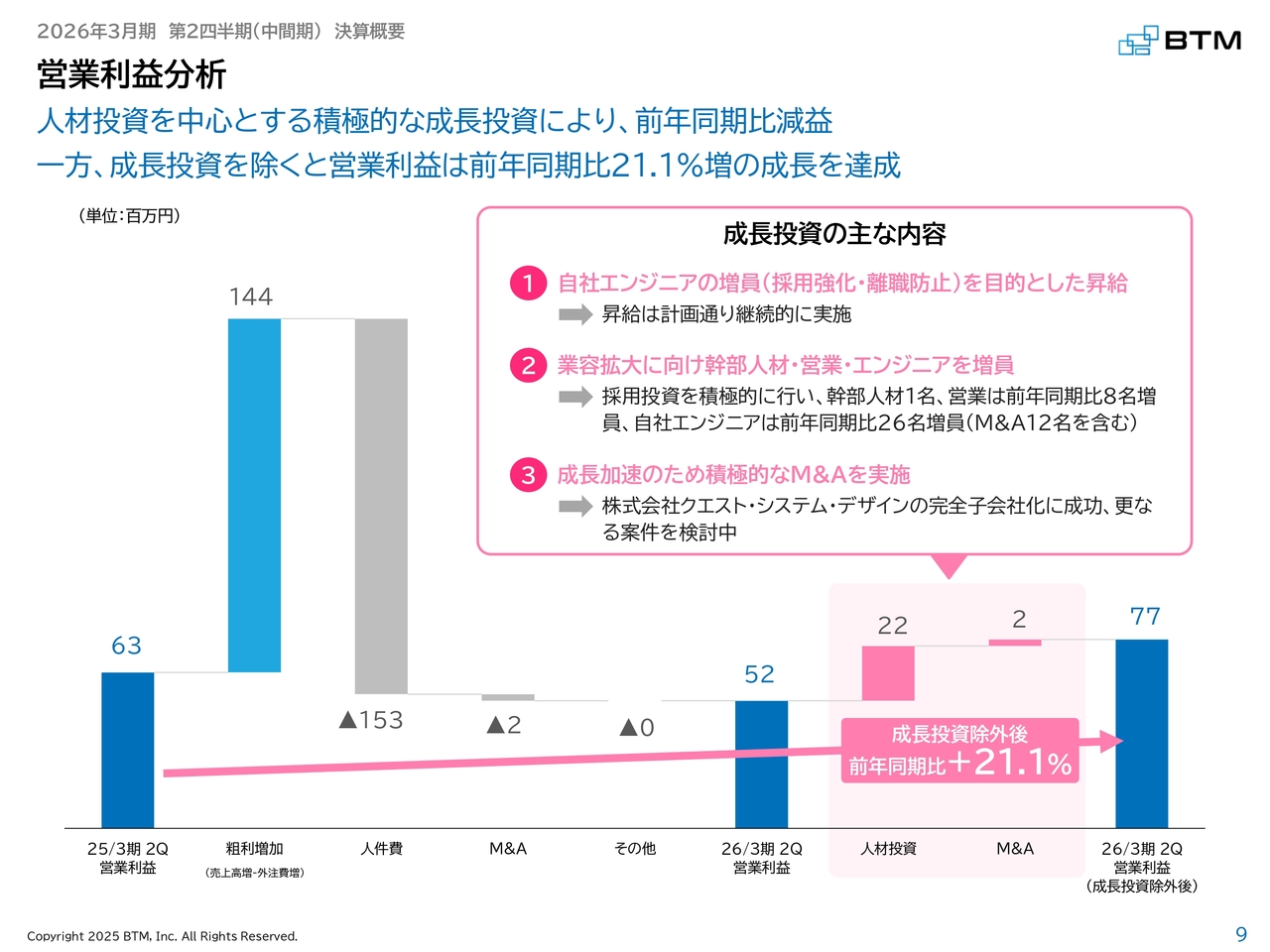 【QAあり】BTM、上期売上高は前年比2桁成長、営業利益は前年同期比34.1%増 人材投資やM&AでAI領域を強化、さらなる事業拡大へ