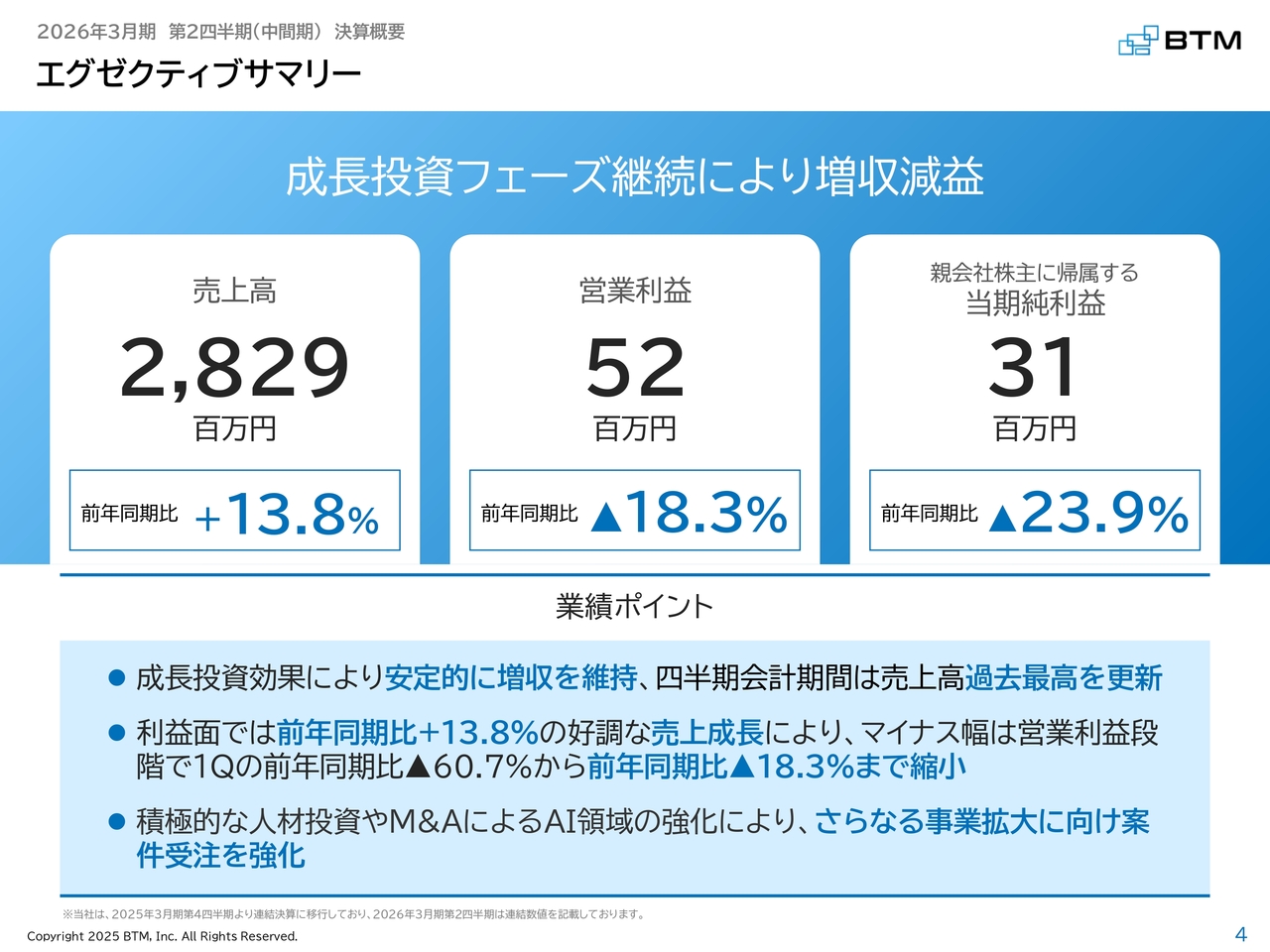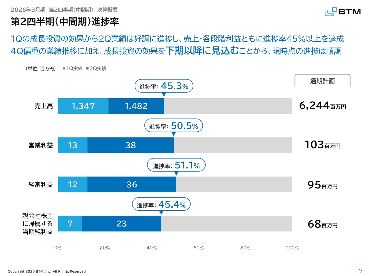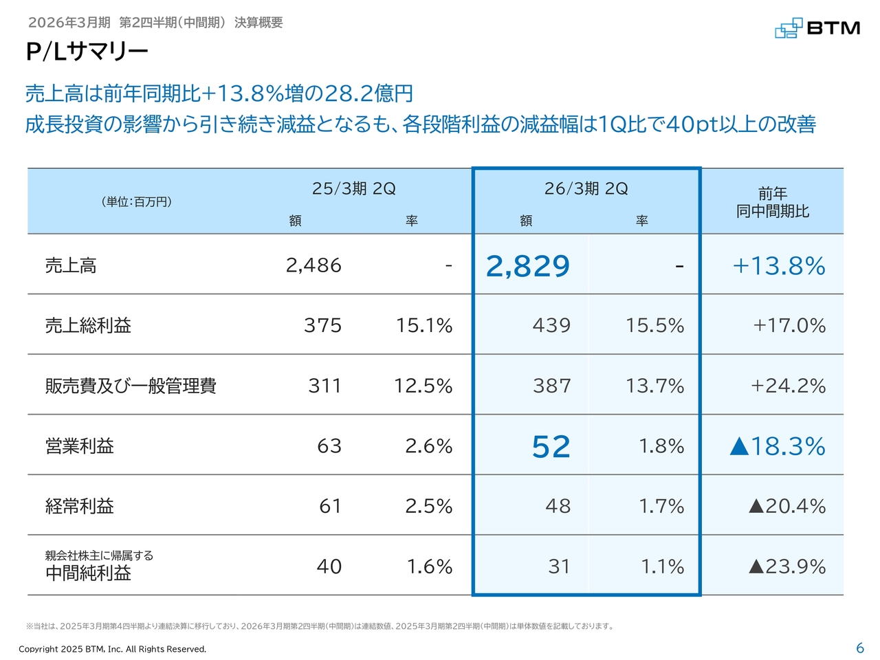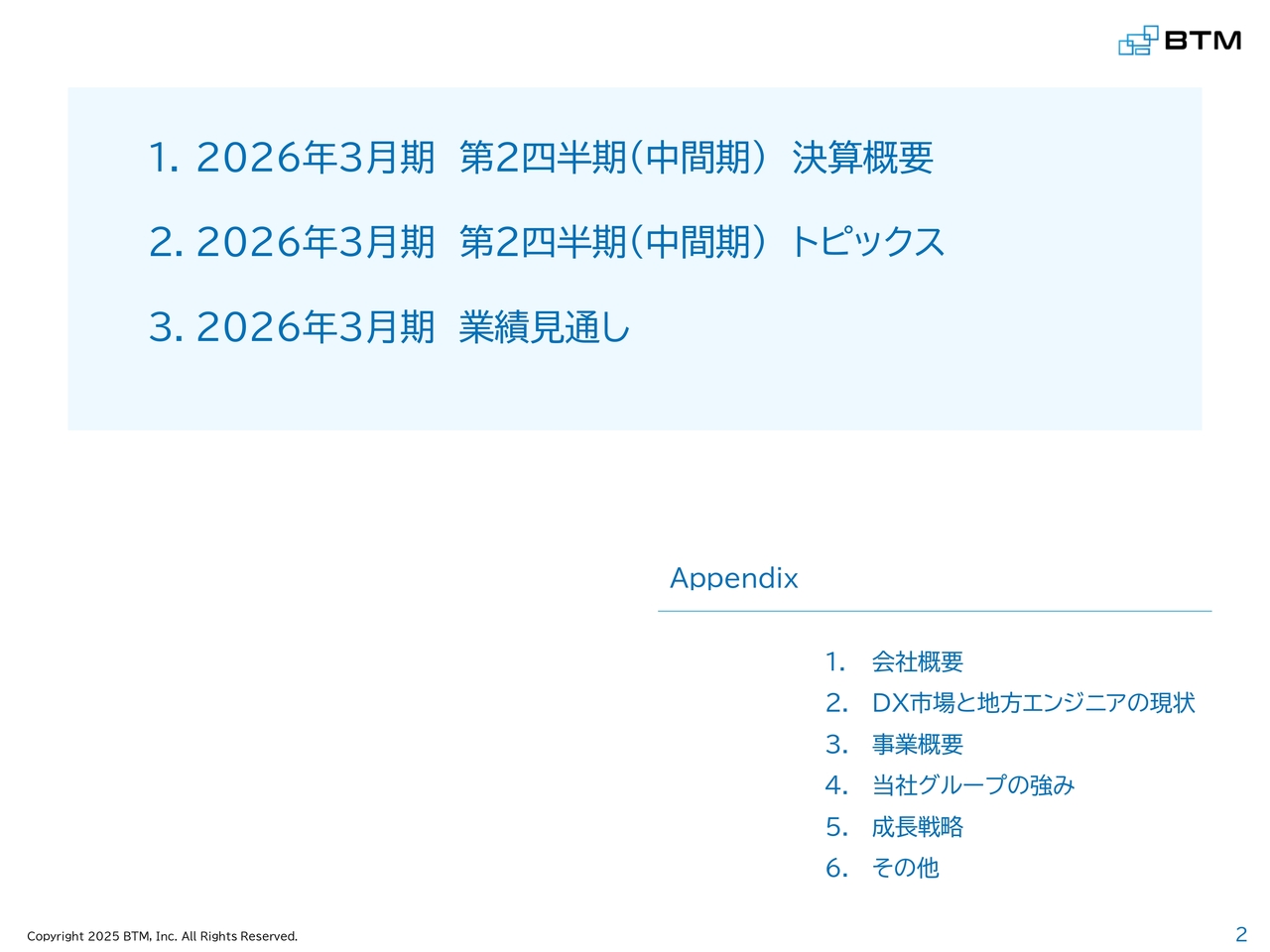 田口雅教氏:2026年3月期第2四半期の決算説明を行います。株式会社BTM代表取締役社長兼CEOの田口です。本日はよろしくお願いします。