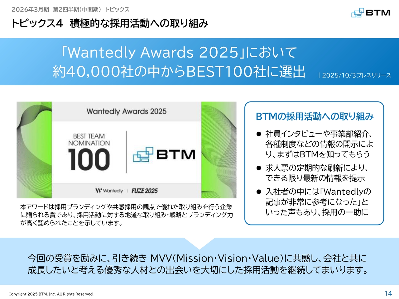 トピックスの4つ目は、積極的な採用活動への取り組みです。当社は「Wantedly Awards 2025」において、約4万社の中からBEST100社に選出されました。これは、当社が採用に力を入れている中で、その実績や採用のノウハウなどを総合的に評価いただいた結果です。