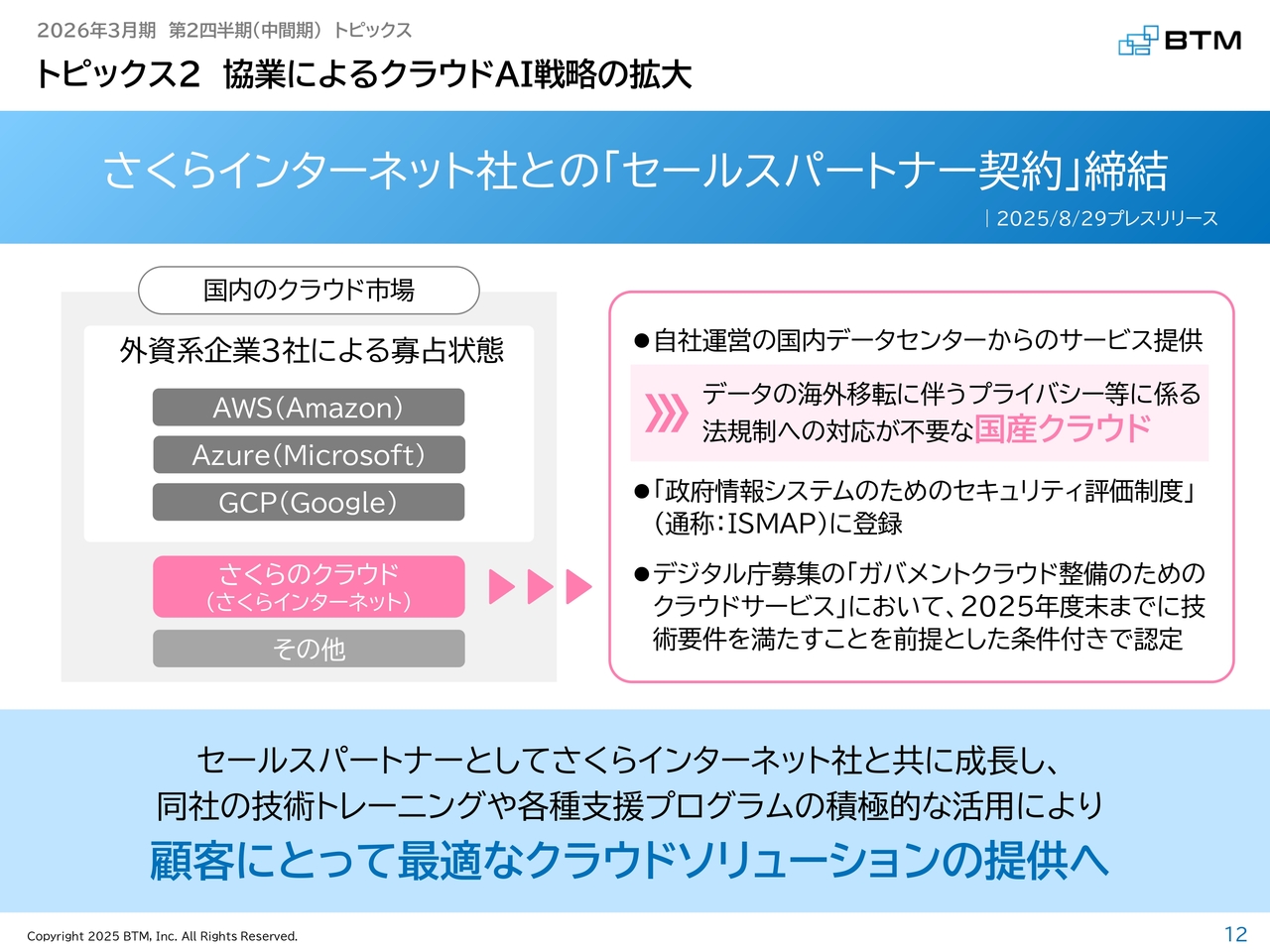 トピックスの2つ目です。協業によるクラウドAI戦略の拡大として、さくらインターネット社と「セールスパートナー契約」を締結しました。