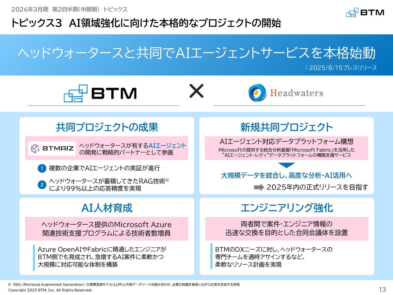 トピックスの3つ目です。AI領域強化に向けて、ヘッドウォータース社と共同でAIエージェントサービスを本格始動しています。