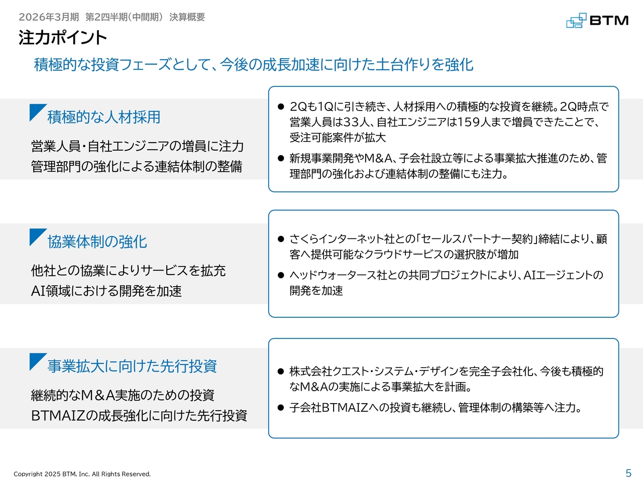 具体的には、クエスト・システム・デザインを完全子会社化しました。今後も積極的にM&Aを推進していきたいと考えています。子会社であるBTMAIZにも積極的な投資を継続しており、管理体制の構築などに注力しています。