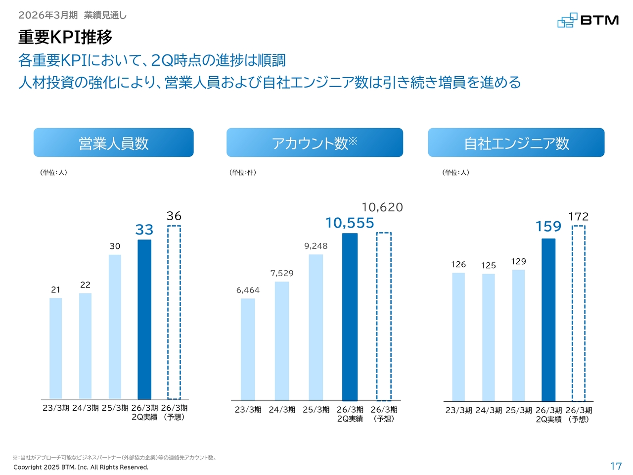 第2四半期実績としては、営業人員数は33人、アカウント数は1万555件、自社エンジニア数は159人となっています。いずれも非常に順調に進捗しています。