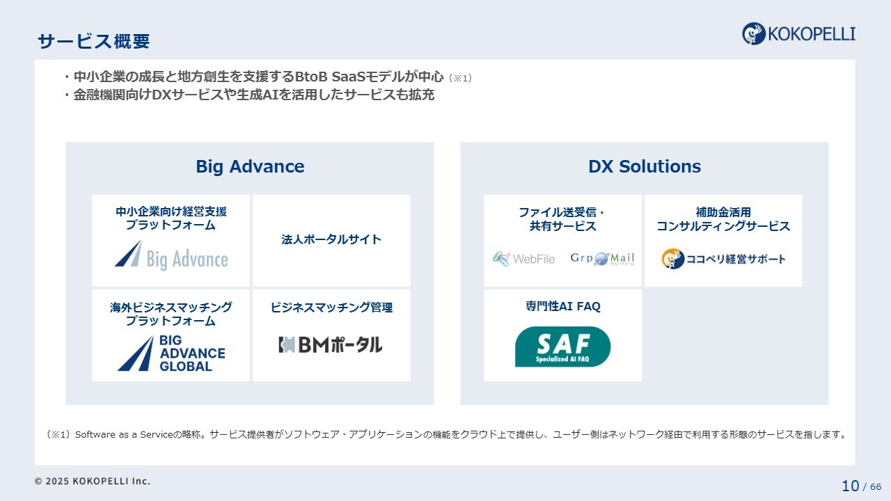 サービス概要です。当社はBig Advance事業とDX Solutions事業の2つに大きく分けて事業を展開しています。基本的に中小企業向けのBtoB SaaSモデルを中心としているため、非常に安定的に推移できる点が当社の強みだと思います。