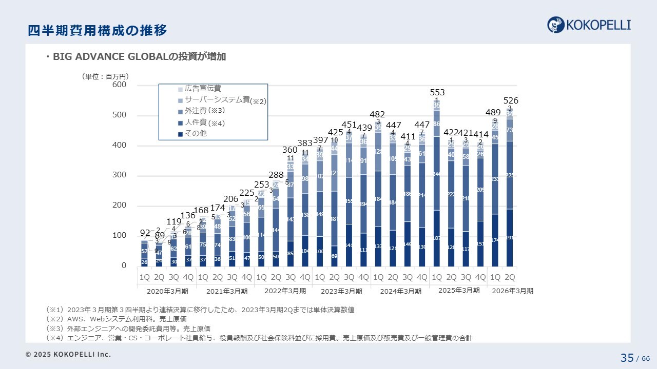 第2四半期の実績についてです。今期は来期以降のさらなる成長を見据えた大規模な投資フェーズにあり、業績予想でも示しているとおり、投資を積極的に進める計画となっています。