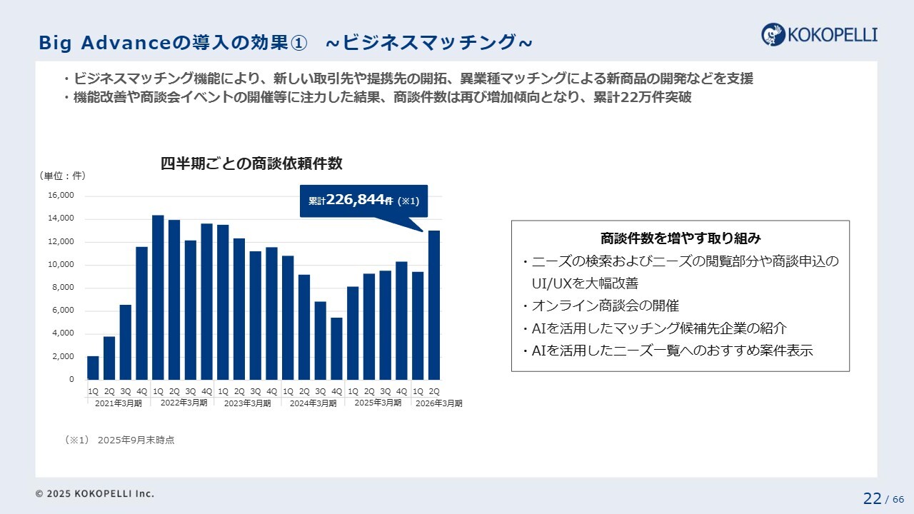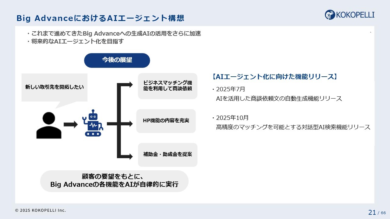 「Big Advance」についてですが、プロダクトとして今後どのように進化していくかについてお話しします。現在、「AIエージェント構想」というテーマで開発を着々と進めています。この構想では、すでに「Big Advance」の中に生成AIを組み込んでおり、例えばビジネスマッチングの商談文章を自動で作成したり、マッチング先をAIが自動で見つけたりといった機能を実現しています。