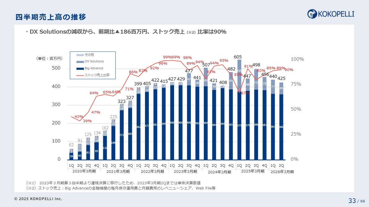 四半期ごとの売上推移についてですが、「Big Advance」は堅調に推移しているものの、「DX Solutions」では前期比で落ち込んでいます。