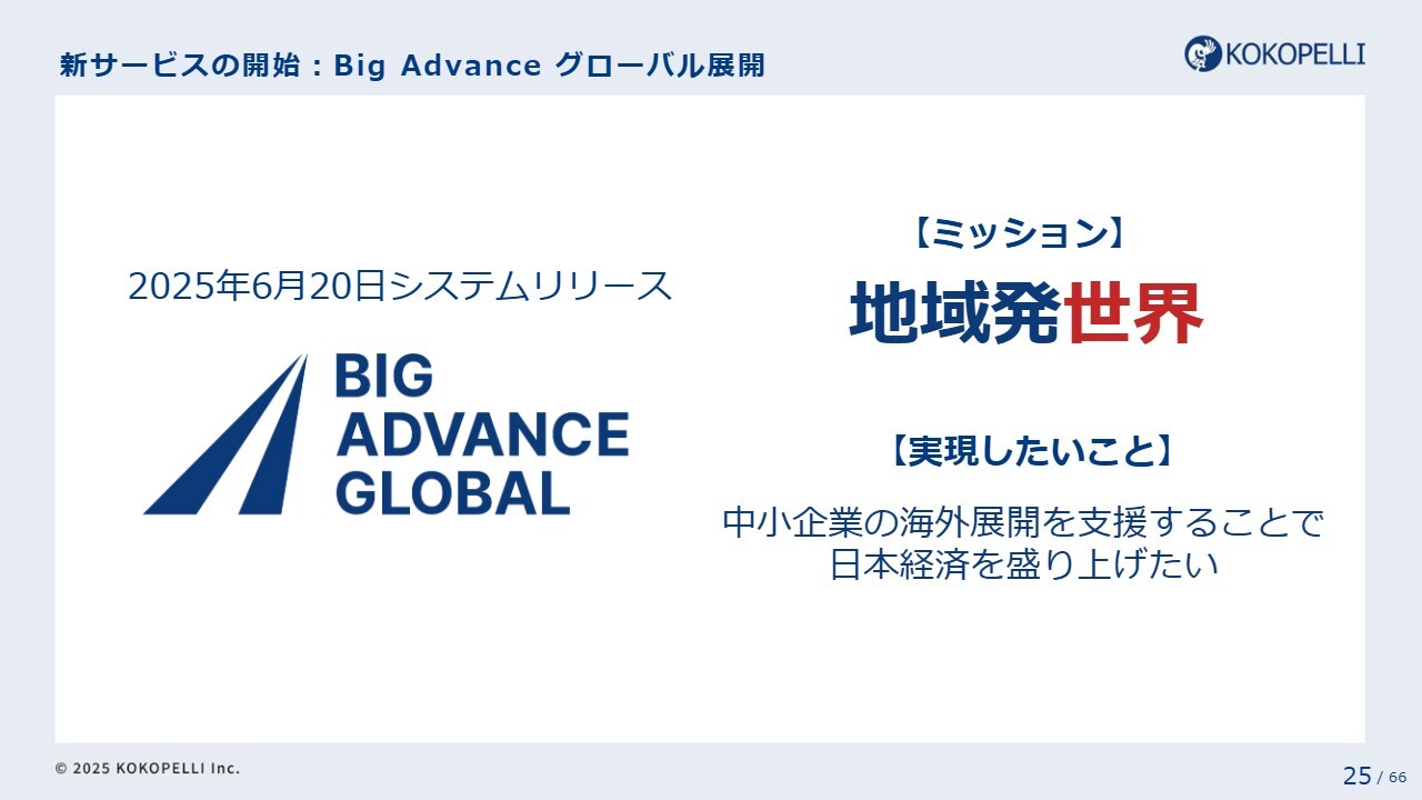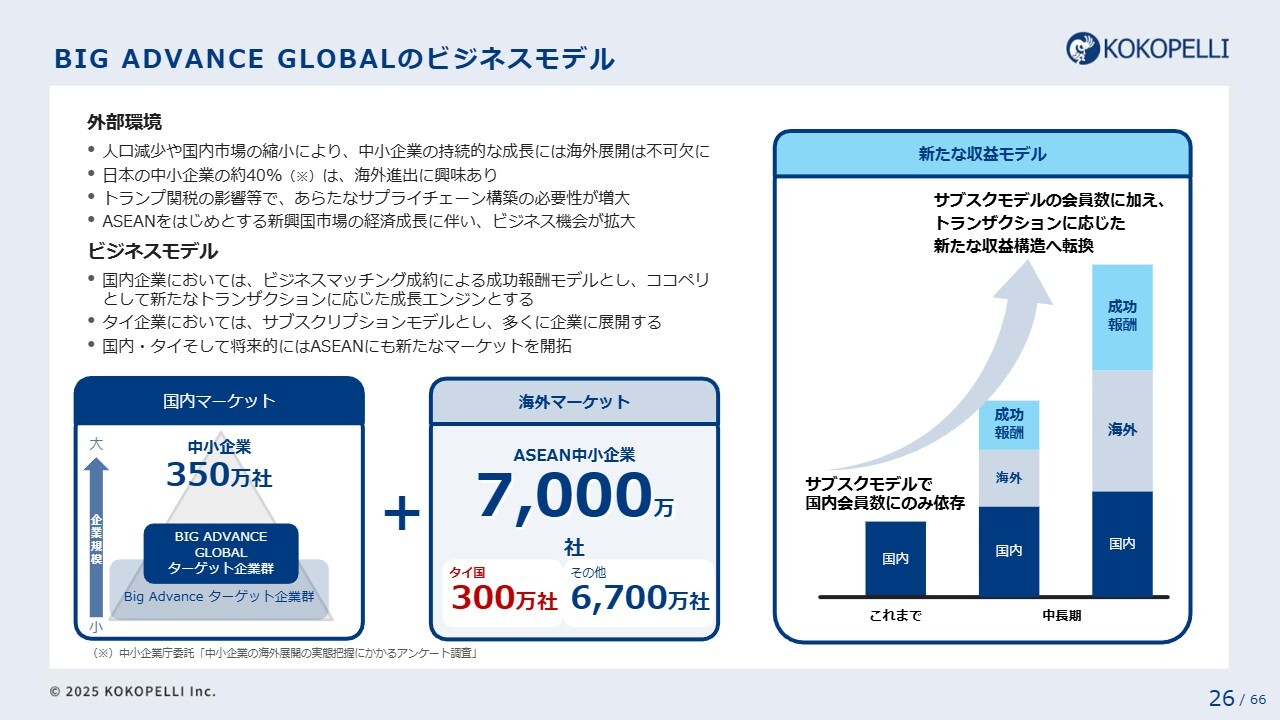 「BIG ADVANCE GLOBAL」のビジネスモデルをあらためて申し上げると、まず国内マーケットについてですが、現在「Big Advance」の利用ユーザーは比較的小規模な事業者が多いものの、今後はもう少し規模の大きな企業も「BIG ADVANCE GLOBAL」のターゲットになっていくと考えています。