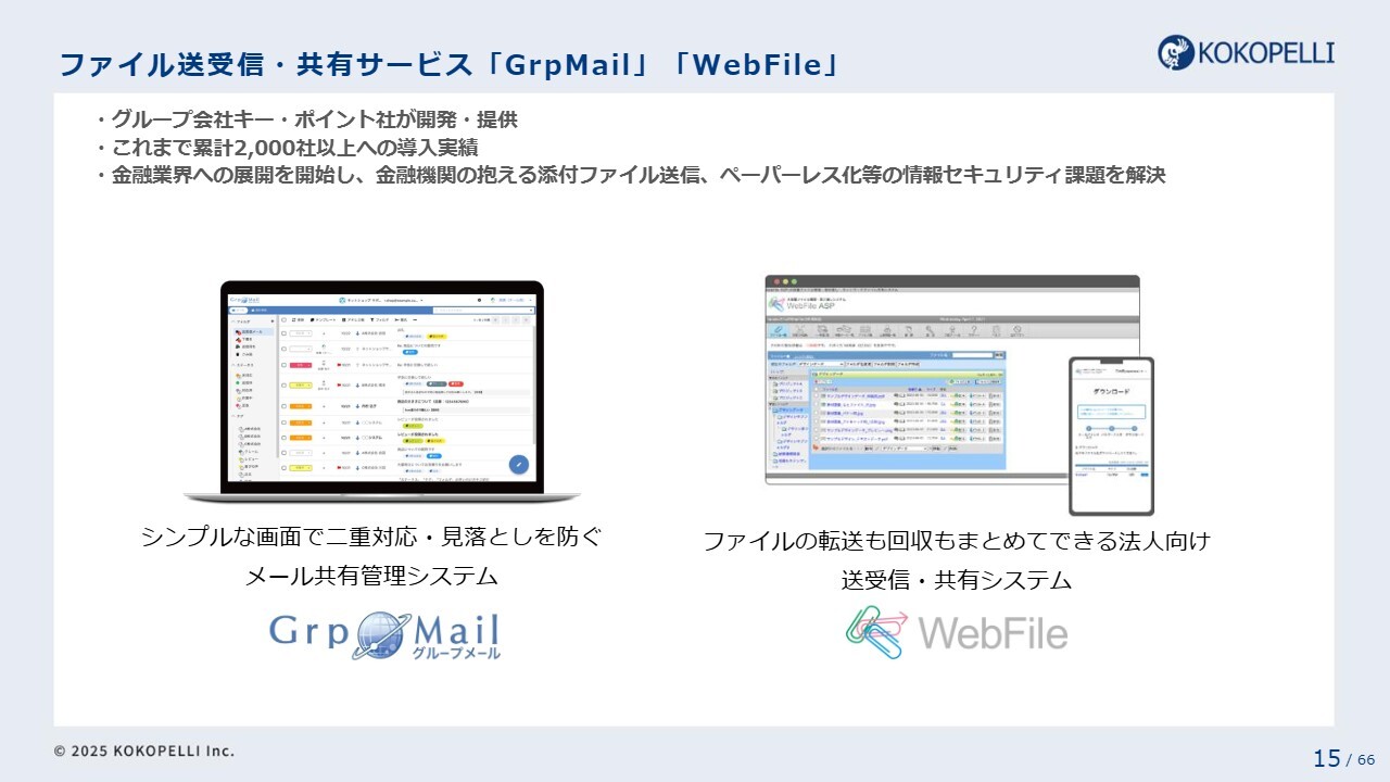 グループ会社であるキー・ポイント社が提供する、ファイル送受信・共有サービス「GrpMail」「WebFile」についてです。もともと2,000社以上に導入されているサービスですが、当社とのグループジョインを契機に、金融機関向けにもサービス提供を開始しました。