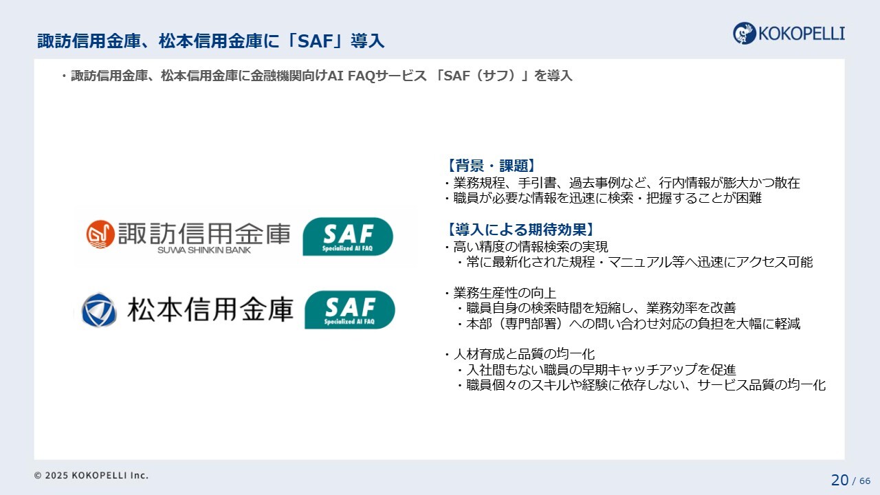 諏訪信用金庫と松本信用金庫にそれぞれ「SAF」を導入いただいたという内容です。