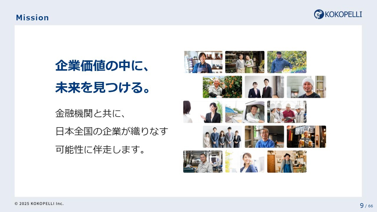 ミッションは「企業価値の中に、未来を見つける。」です。多くの企業の価値を高めるために、私たちはテクノロジーを活用し、日本全国の地域金融機関とともに支援を行うスタンスで事業を展開しています。