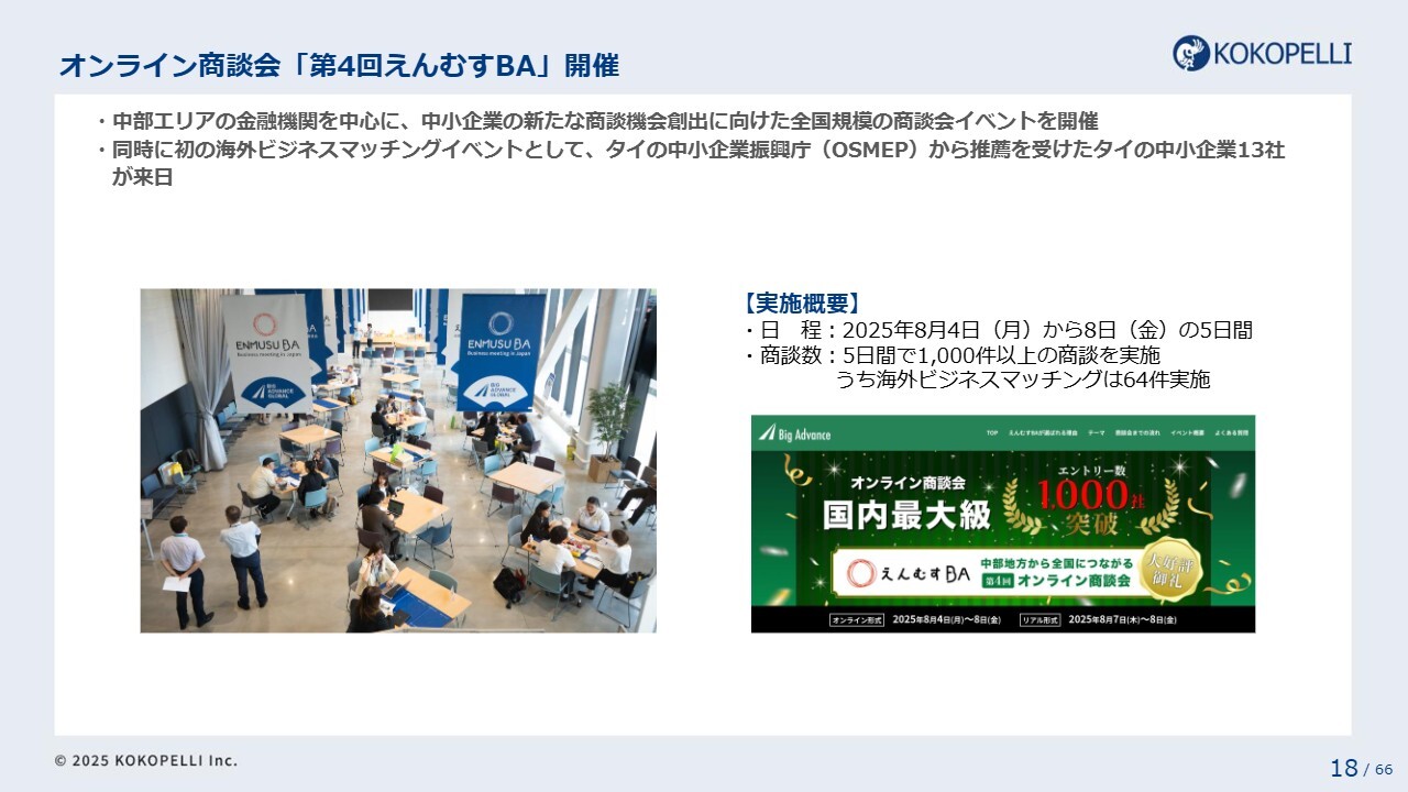 その結果、約1,000件以上の商談が実施され、多くのマッチングが行われました。また、今回初めての取り組みとして、海外のビジネスマッチングイベントを開催しました。我々が提携しているタイの中小企業振興庁(OSMEP)と協力し、OSMEPから推薦を受けたタイの企業に日本へ来てもらい、マッチングを実施しました。