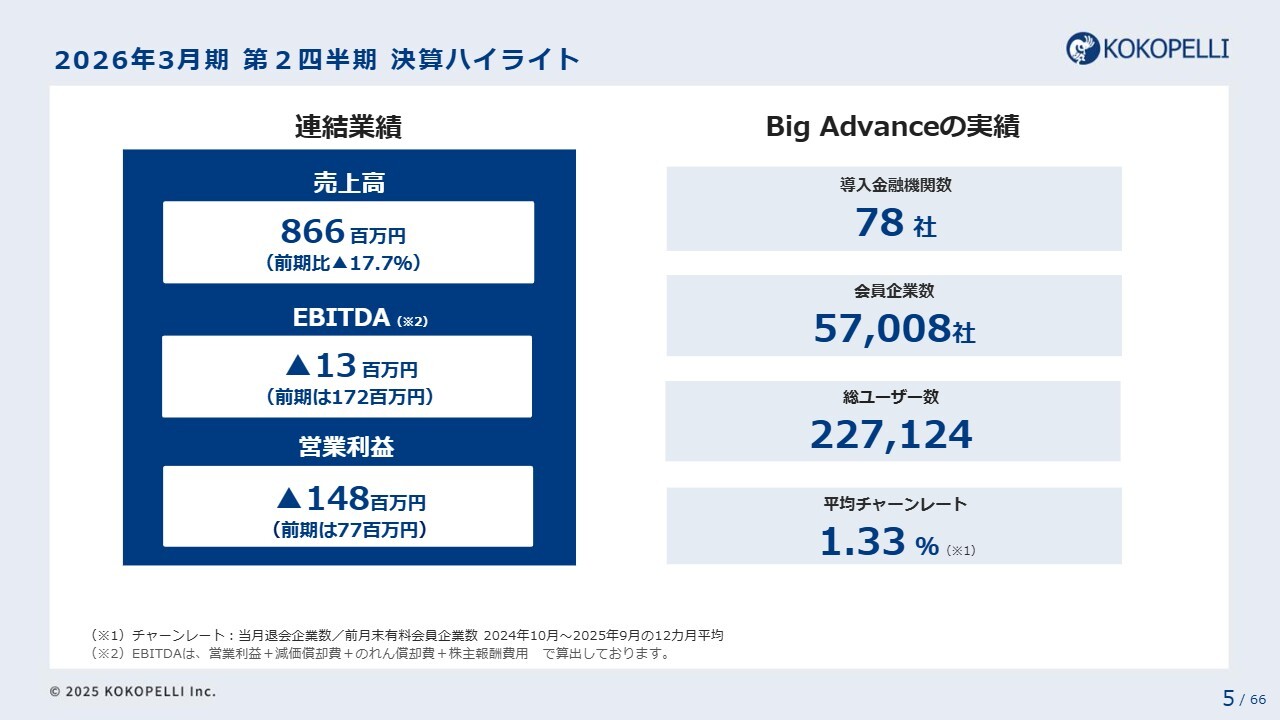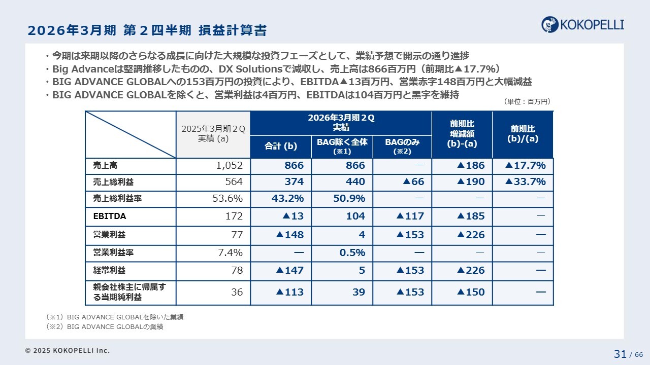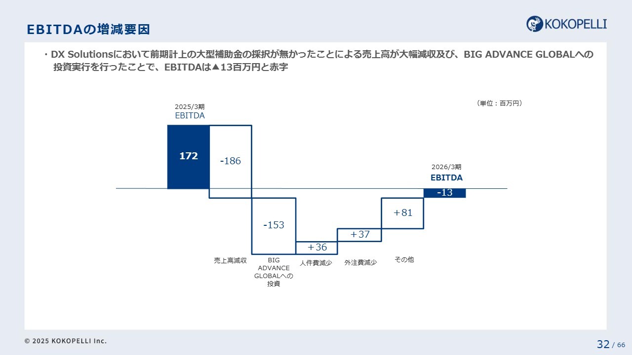 「Big Advance」は堅調に推移したものの、「DX Solutions」では補助金による大型売上がなかったため、売上高は8億6,600万円となりました。「BIG ADVANCE GLOBAL」への投資は1億5,300万円を計上しており、EBITDAはマイナス1,300万円、営業赤字は1億4,800万円となっています。